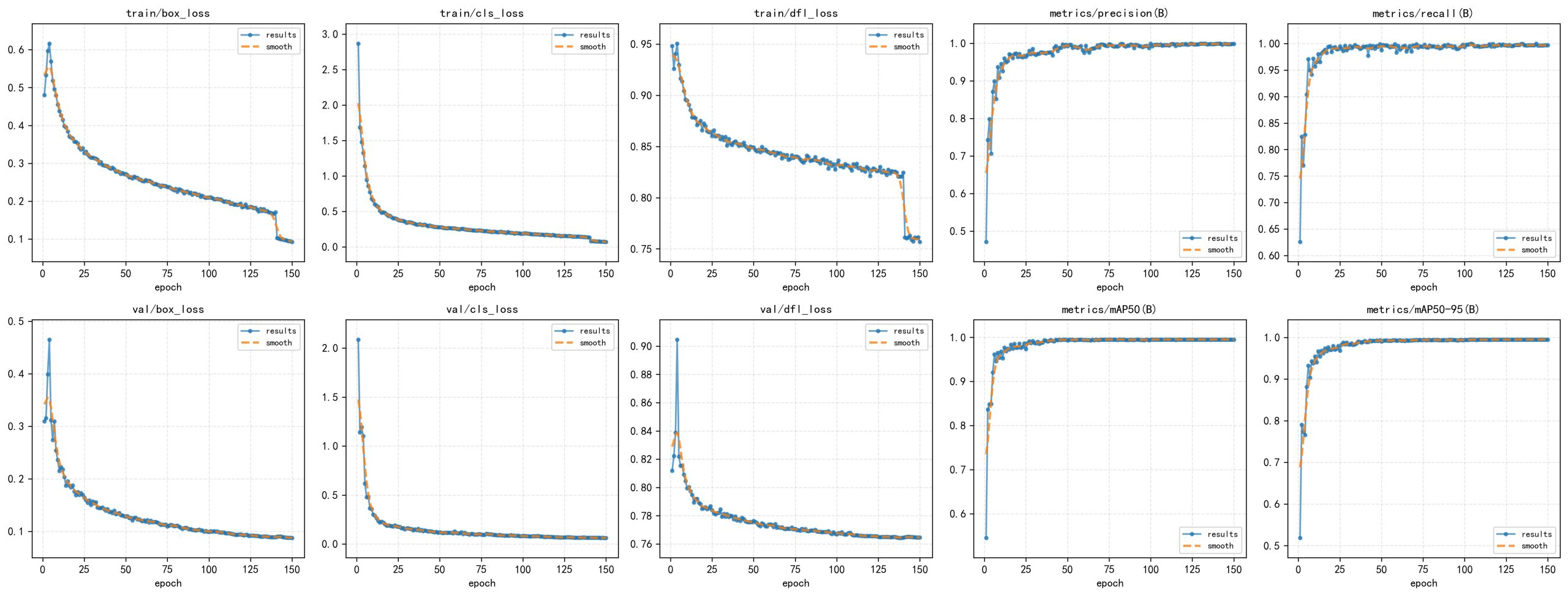 模型性能指标在训练过程中持续提升。Precision(精确率)曲线从初始的47.1%快速上升,在第20轮达到96.3%,在第50轮达到99.2%,随后继续稳步提升,最终稳定在99.86%的卓越水平;Recall(召回率)曲线从初始的62.6%稳步提升,在第20轮达到98.4%,在第50轮达到98.7%,最终达到99.69%,表明模型对目标的检测能力优异;mAP@50指标从初始的54.5%快速上升,在第20轮达到97.7%,在第50轮达到99.3%,最终稳定在99.50%,显示模型在IoU阈值为0.5时具有极高的检测精度;mAP@50-95指标从初始的51.9%持续上升,在第20轮达到97.1%,在第50轮达到99.0%,在整个150轮训练过程中保持稳定增长态势,最终达到99.48%,表明模型在严格的IoU阈值范围(0.5至0.95)下仍能保持卓越的检测性能,证明了模型定位精度的准确性。