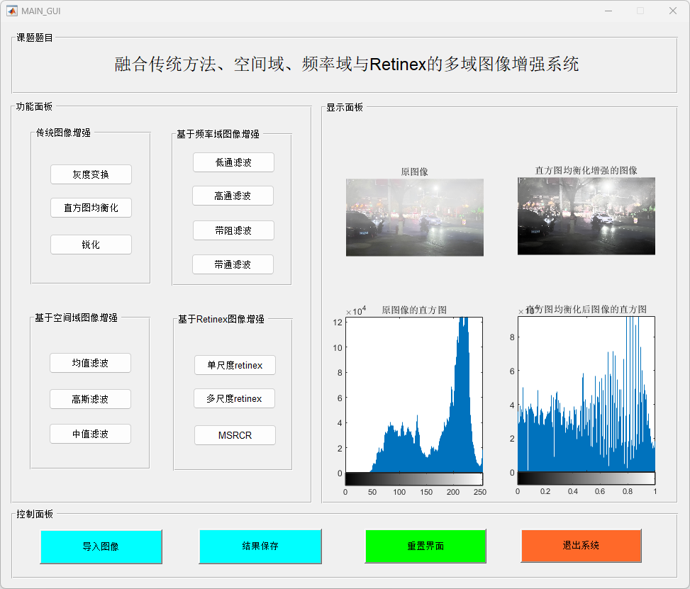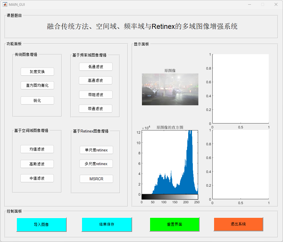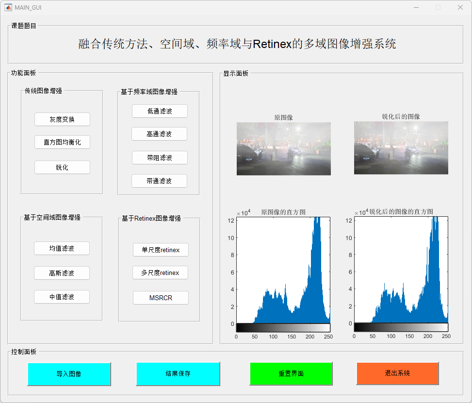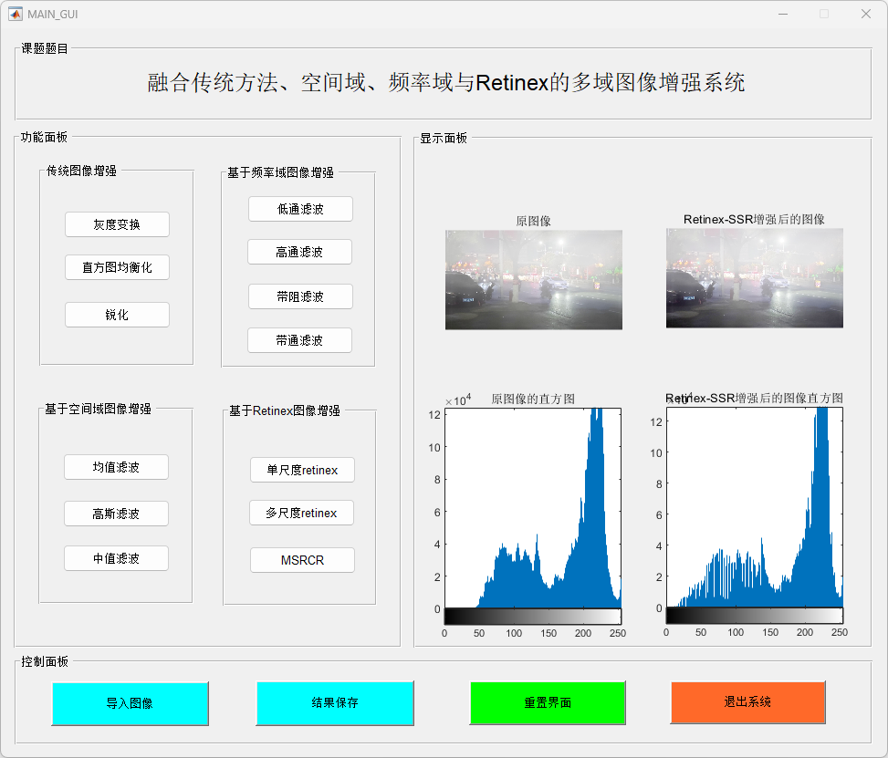 摘要:随着图像处理技术的不断发展,图像增强在多个领域中得到了广泛应用,尤其是在低光、去雾、夜间监控等复杂环境下。本文提出了一种基于MATLAB的多域图像增强系统,该系统集成了传统图像增强方法、空间域增强、频率域增强和基于Retinex的图像增强算法。该系统通过用户友好的图形界面(GUI)实现了多种图像增强功能,旨在提高图像的可视性、细节和对比度。