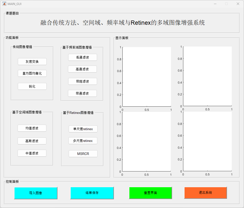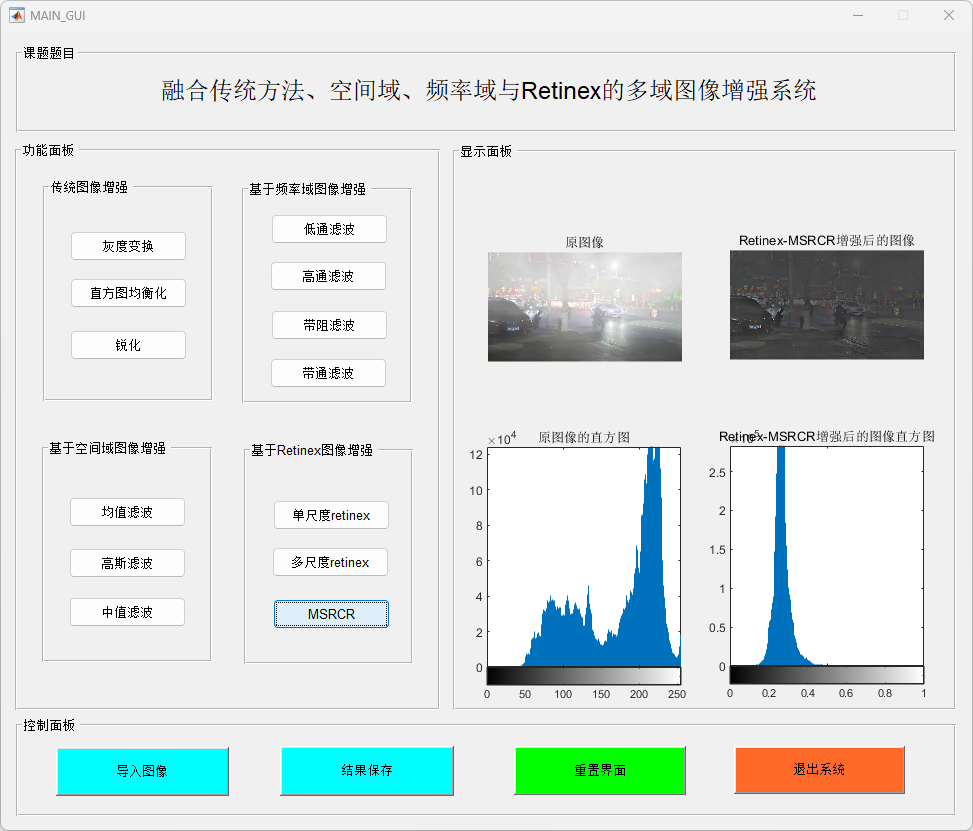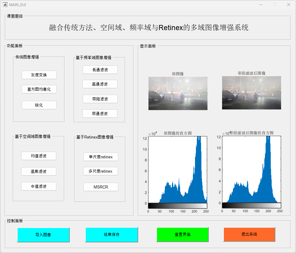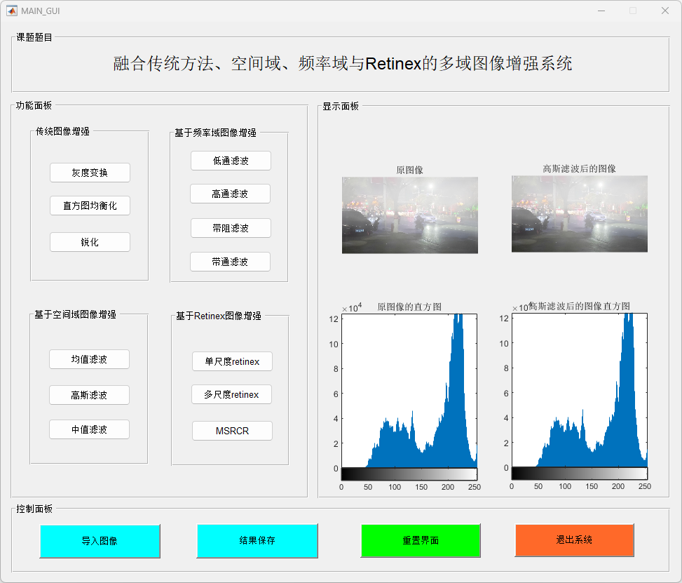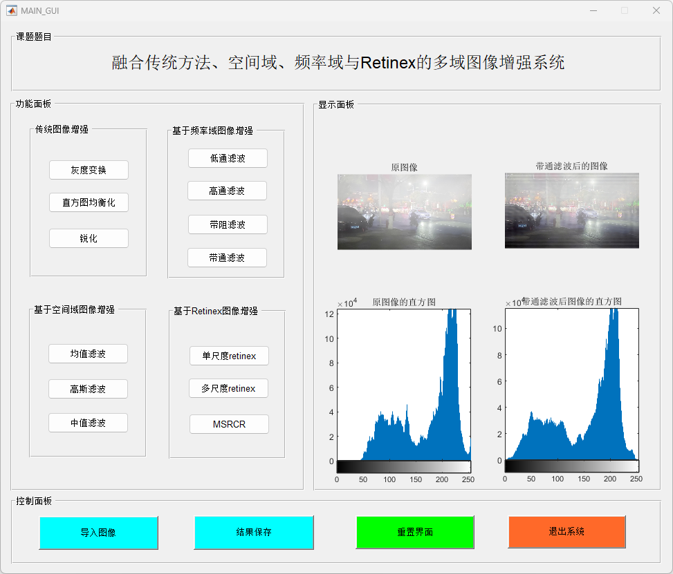 摘要:随着图像处理技术的不断发展,图像增强在多个领域中得到了广泛应用,尤其是在低光、去雾、夜间监控等复杂环境下。本文提出了一种基于MATLAB的多域图像增强系统,该系统集成了传统图像增强方法、空间域增强、频率域增强和基于Retinex的图像增强算法。该系统通过用户友好的图形界面(GUI)实现了多种图像增强功能,旨在提高图像的可视性、细节和对比度。