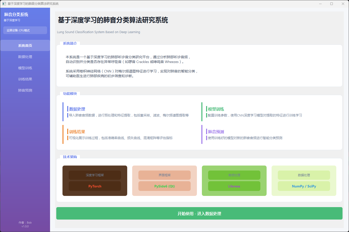 PySide6 GUI 前端 + PyTorch CNN 后端,通过 Librosa 提取肺音梅尔频谱图特征,实现四分类(正常/啰音/哮鸣音/两者)的深度学习肺音诊断系统。