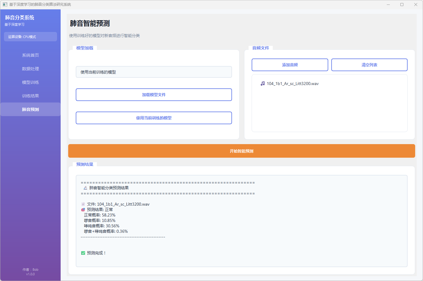 实验结果表明,该方法能够有效识别肺音中的异常特征,为计算机辅助肺部疾病筛查提供了可行的技术方案。本文同时开发了基于PySide6的可视化系统,集成数据处理、模型训练、结果分析和实时预测功能,具有良好的实用价值。