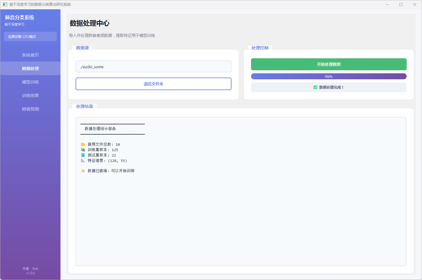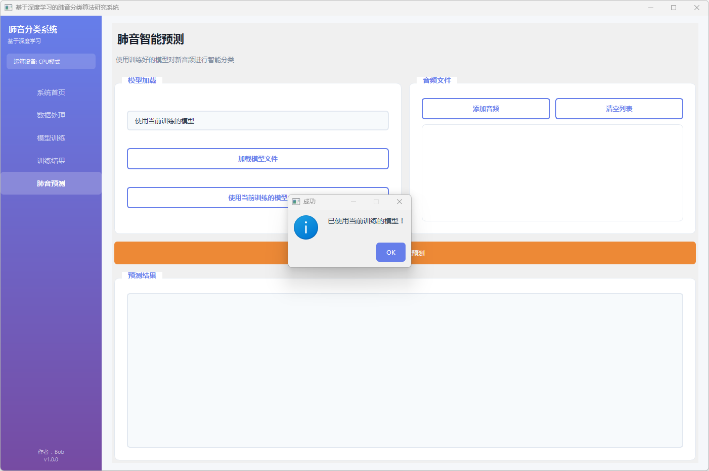 运行 python main.py 启动系统,依次完成”数据处理”→”模型训练”→”训练结果”→”肺音预测”四步操作即可。