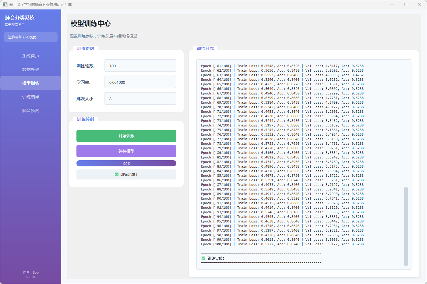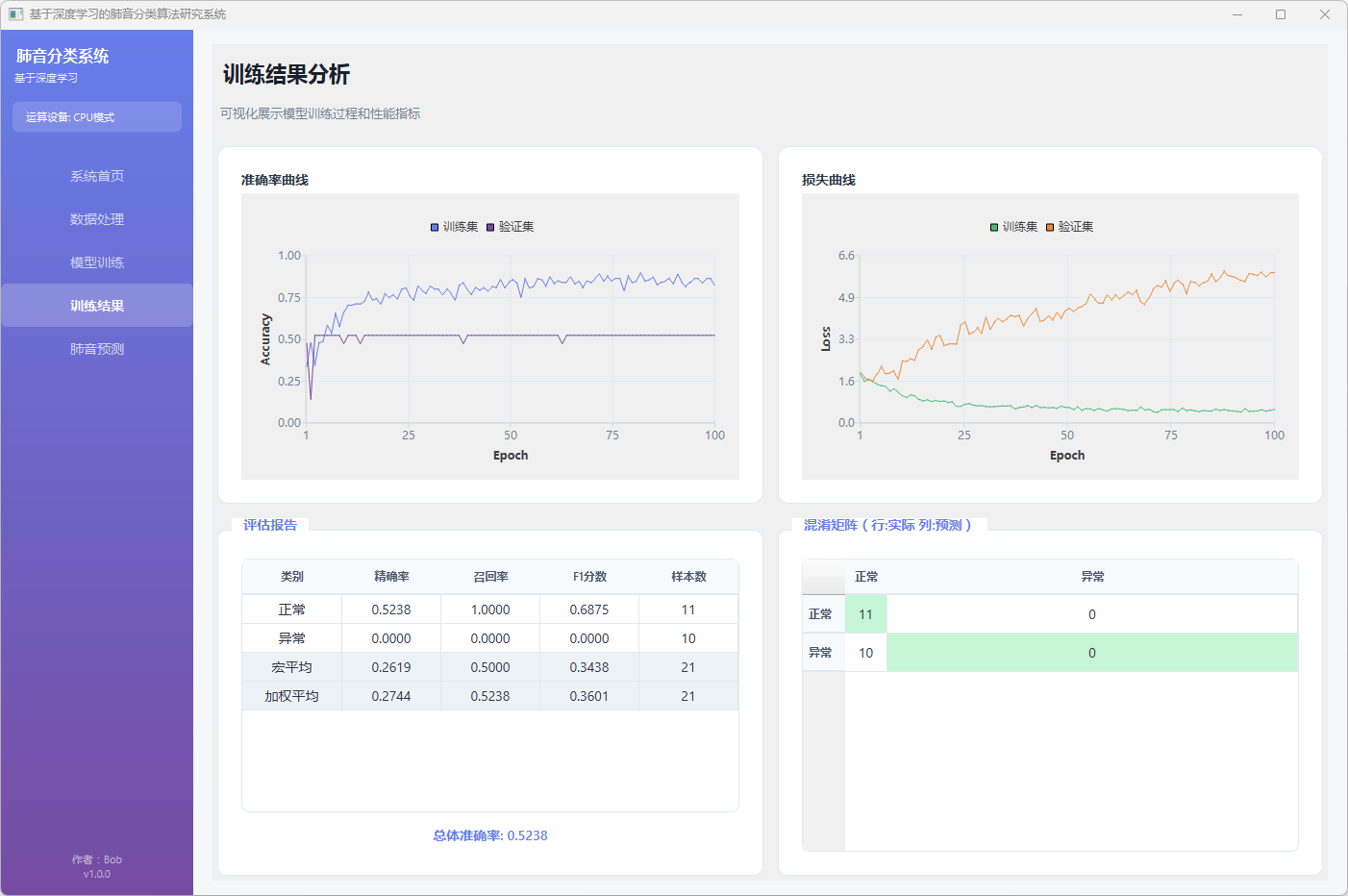 系统整体运行稳定,轻量级CNN配合数据增强和类别过采样有效应对小样本不平衡问题,分类结果准确可靠,满足肺音智能诊断的实际需求。