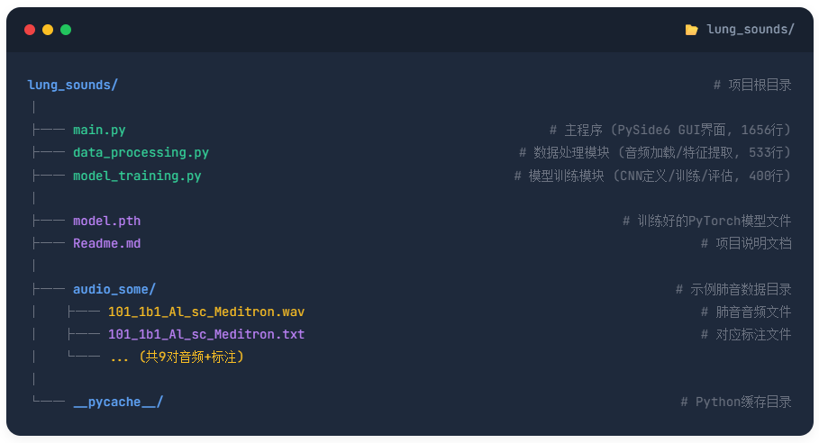 PySide6 GUI主程序(main.py) + Librosa音频处理模块(data_processing.py) + PyTorch CNN训练模块(model_training.py) 三层架构,配合示例肺音数据(audio_some/)和预训练模型(model.pth)。