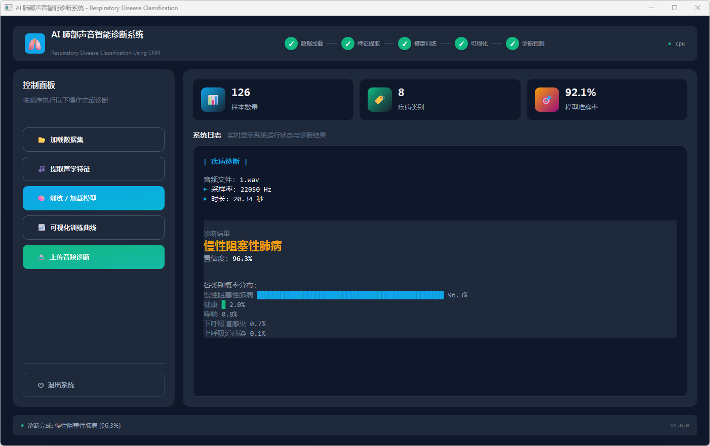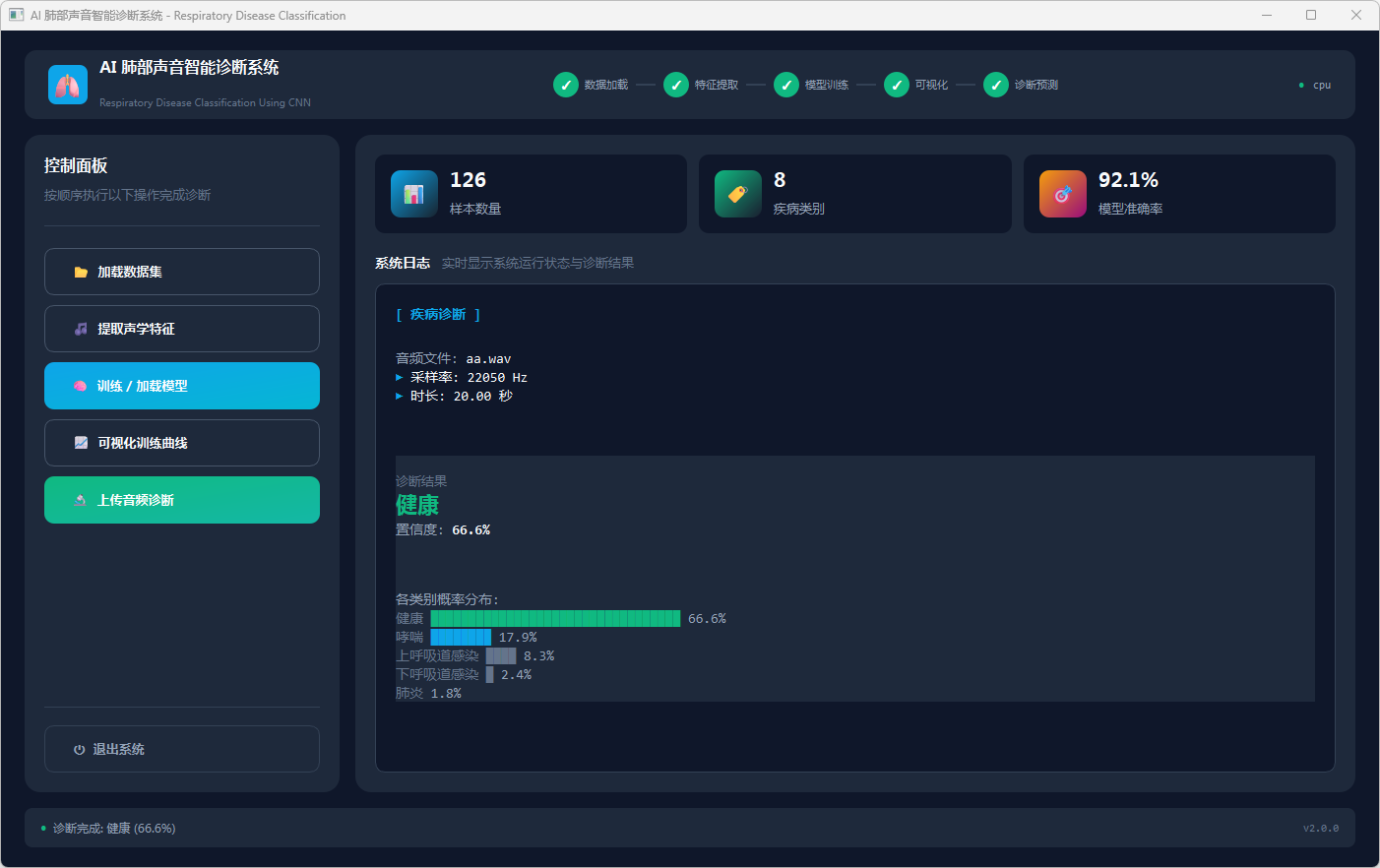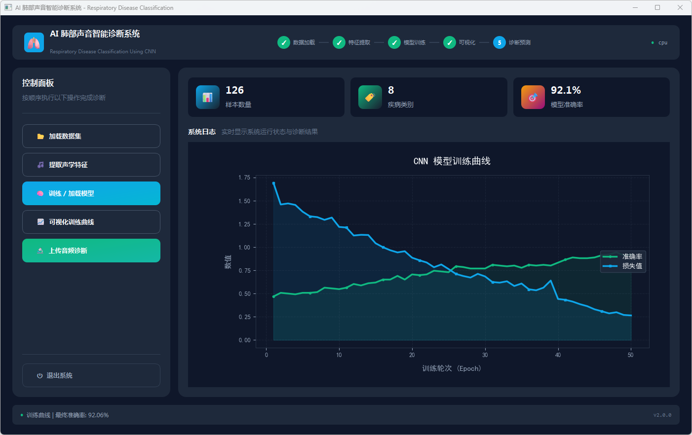 在系统实现方面,基于 PySide6 框架开发了桌面端图形用户界面,集成数据加载、特征提取、模型训练、训练过程可视化和实时诊断五个功能模块。实验结果表明,该模型能够有效区分上述 8 类呼吸系统疾病,用户仅需上传肺部声音音频文件,系统即可自动输出疾病分类结果及相应置信度。整体系统操作流程清晰、界面友好,具有一定的临床辅助诊断应用潜力。