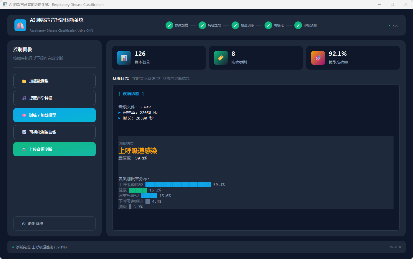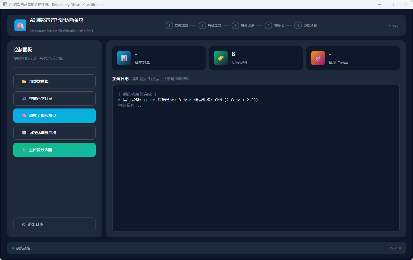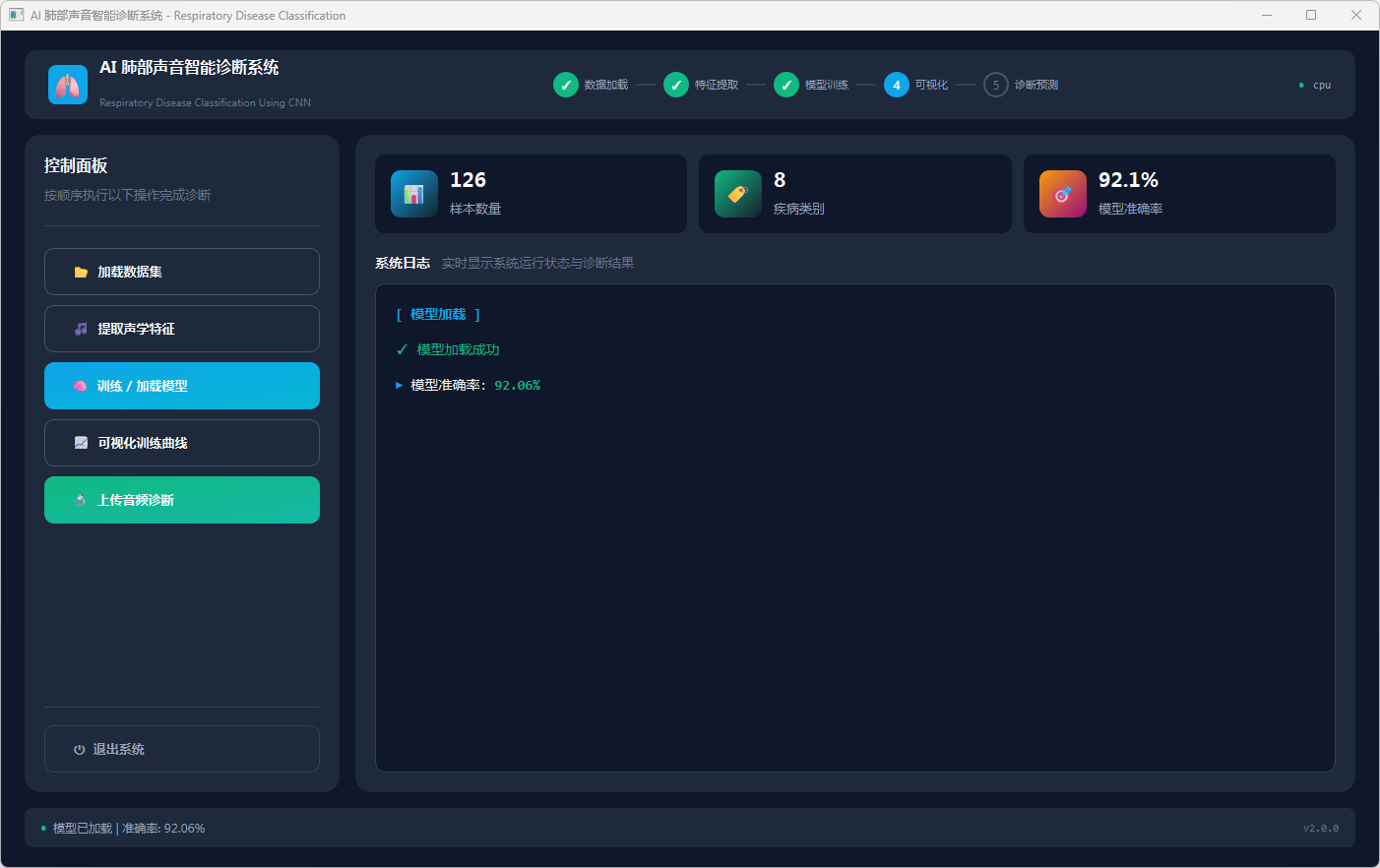 在系统实现方面,基于 PySide6 框架开发了桌面端图形用户界面,集成数据加载、特征提取、模型训练、训练过程可视化和实时诊断五个功能模块。实验结果表明,该模型能够有效区分上述 8 类呼吸系统疾病,用户仅需上传肺部声音音频文件,系统即可自动输出疾病分类结果及相应置信度。整体系统操作流程清晰、界面友好,具有一定的临床辅助诊断应用潜力。