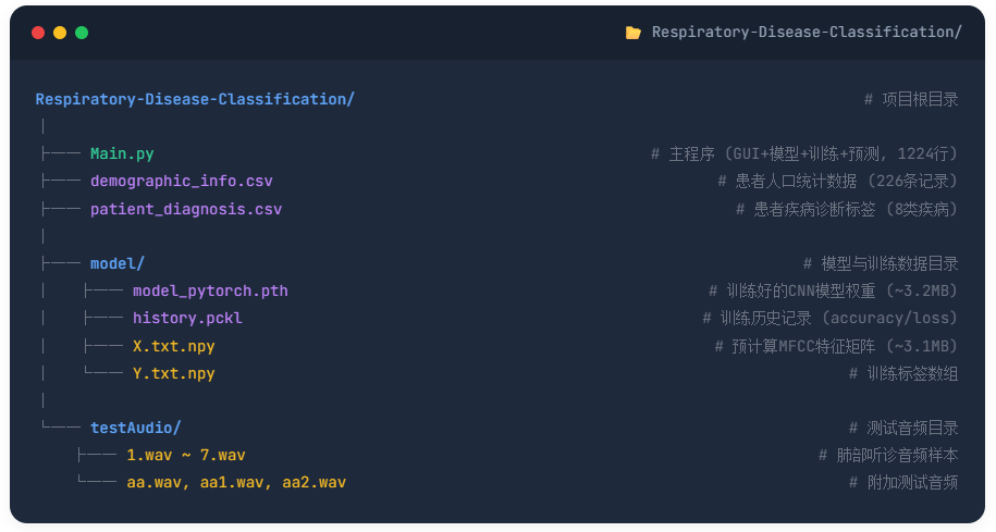 呼吸系统疾病是全球主要健康威胁,传统肺部听诊依赖医生经验且难以标准化,本项目通过卷积神经网络自动学习肺部声音 MFCC 特征,实现呼吸疾病的计算机辅助诊断。