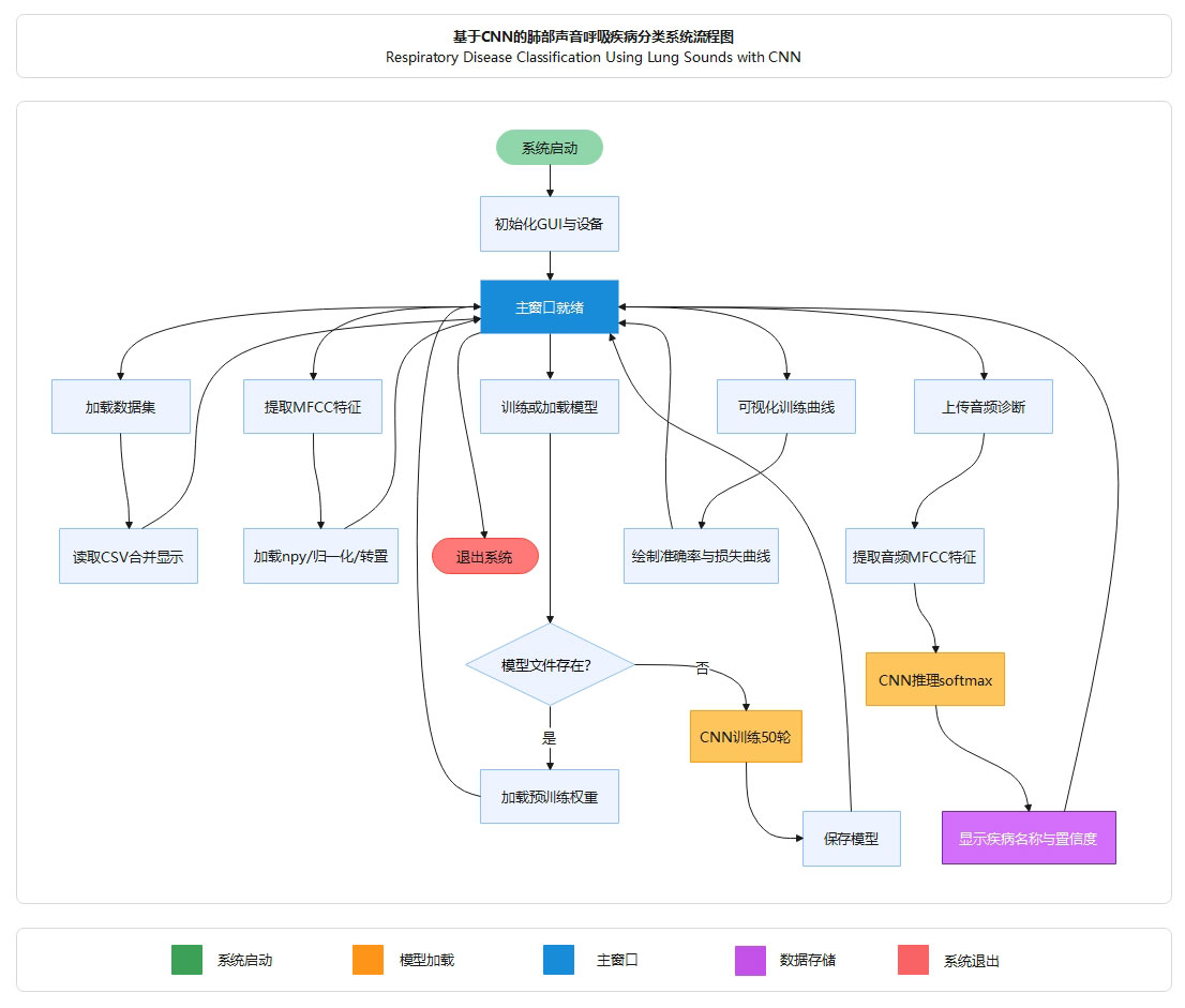 系统启动并初始化GUI后,用户依次执行加载项目采用单文件架构,核心代码全部集中在Main.py,包含LungSoundCNN模型类、TrainThread训练线程类和MainWindow主──口类,配合model目录存放预训练权重及特征数据、testAudio目录存放测试音频、以及两个CSV患者数据文件。CSV数据集、提取MFCC特征、训练或加载CNN模型、可视化训练曲线、上传WAV音频进行疾──诊断五个步骤,每步完成后返回主窗口等待下一步操作,最终退出系统。