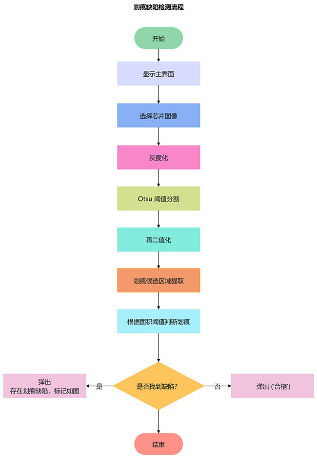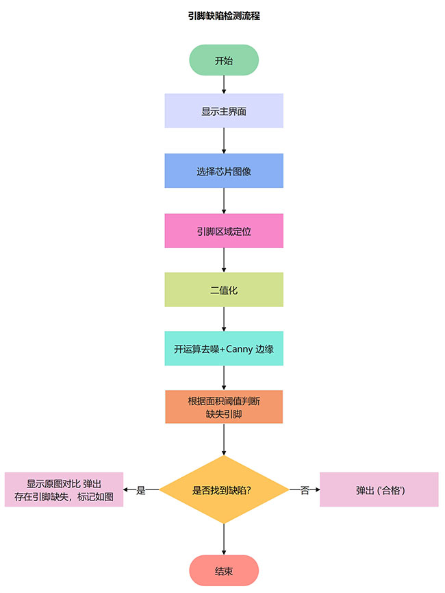 该系统采用灰度化处理消除彩色信息的干扰,并通过边缘检测(Sobel算子)与形态学运算(腐蚀、开运算和闭运算)对图像进行预处理和特征提取,以增强缺陷区域的显著性。利用区域分析方法,对图像中提取出的缺陷区域进行筛选和分类,特别是针对缺失引脚和表面刮痕等常见缺陷进行识别。