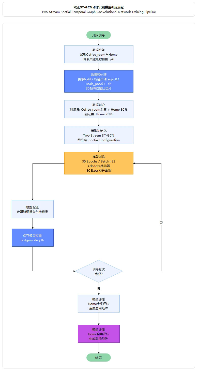 数据集采用咖啡室和家庭两个场景的人体骨骼关键点数据,包含 7 类动作标注,经滑动窗口切片为 30 帧时序样本,使用 Adadelta 优化器和 BCELoss 训练双流 ST-GCN 模型 30 轮。