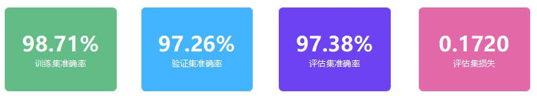 模型经 30 轮训练后,训练准确率达 98.71%,验证准确率 97.26%,验证损失收敛至 0.1726,训练与验证差距约 1.45%,无明显过拟合。