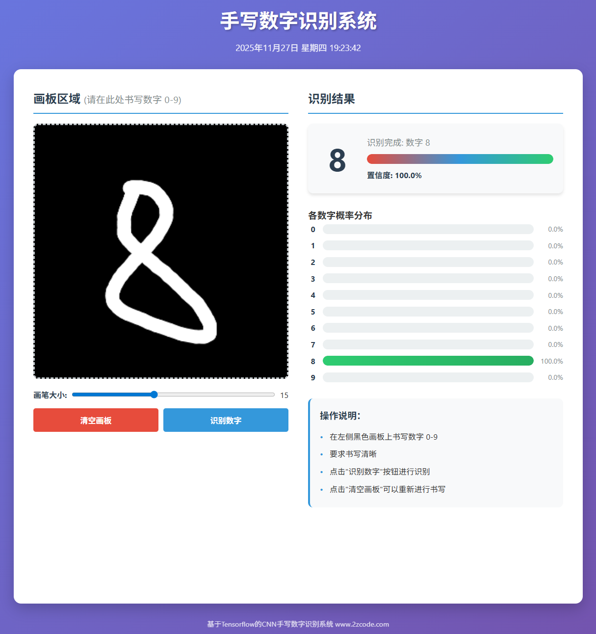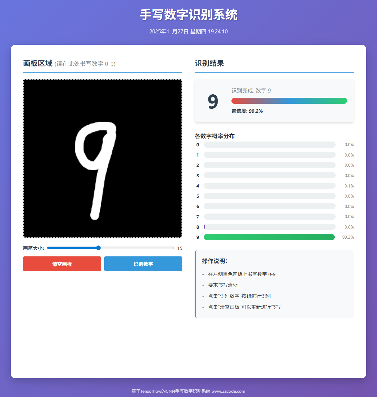 随着深度学习技术的发展,卷积神经网络(Convolutional Neural Network,CNN)在图像分类任务中取得了显著的成效。手写数字识别作为计算机视觉中的经典问题,广泛应用于邮政、金融、车牌识别等领域。本论文基于卷积神经网络,设计并实现了一种手写数字识别系统,该系统能够高效地识别手写数字,并通过 Web 应用提供实时预测服务。