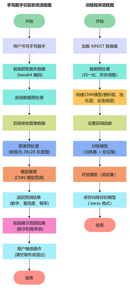 本系统基于卷积神经网络(CNN)和Flask框架,结合HTML5 Canvas技术实现前端手写数字输入,后端通过深度学习模型进行数字识别,并将结果通过Web界面实时反馈给用户。