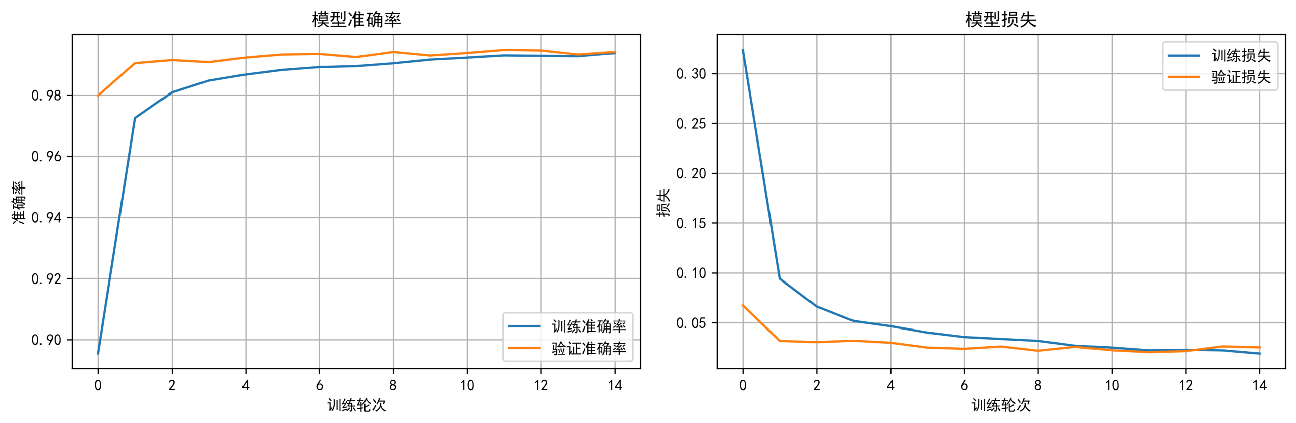 (2)图表中的准确率和损失曲线展示了模型训练的收敛性,并证明了模型在测试集上能够达到高准确率,适用于实际的手写数字识别任务。