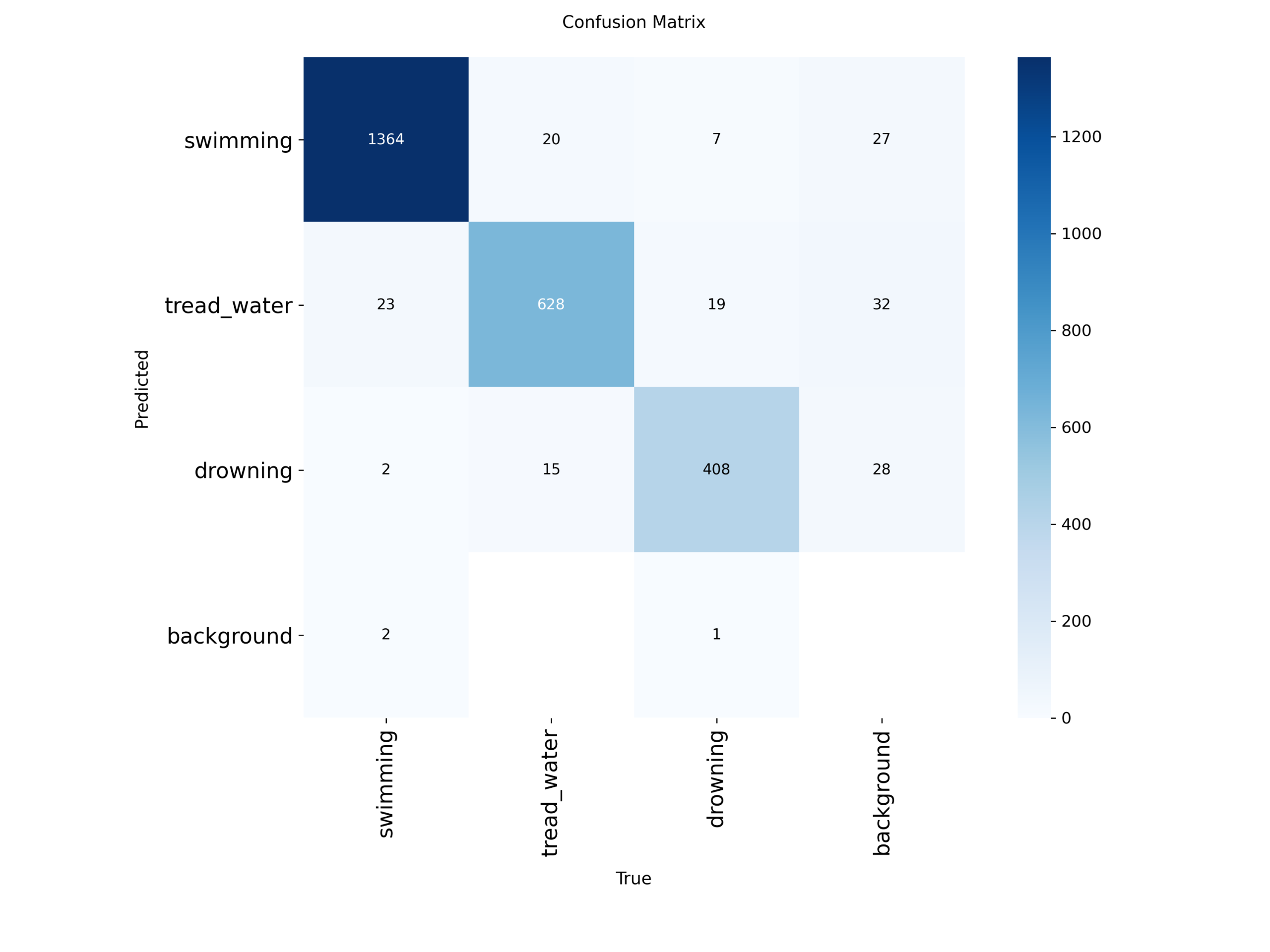 该数据集共包含 8,642 张图像及 12,622 个标注实例,采用 YOLO 格式进行边界框标注,定义了三类目标行为:游泳(swimming,7,260 个实例)、踩水(tread_water,3,305 个实例)和溺水(drowning,2,057 个实例)。三类行为在水中的姿态表现具有渐进性差异,能够有效反映从正常活动到危险状态的行为演变过程。