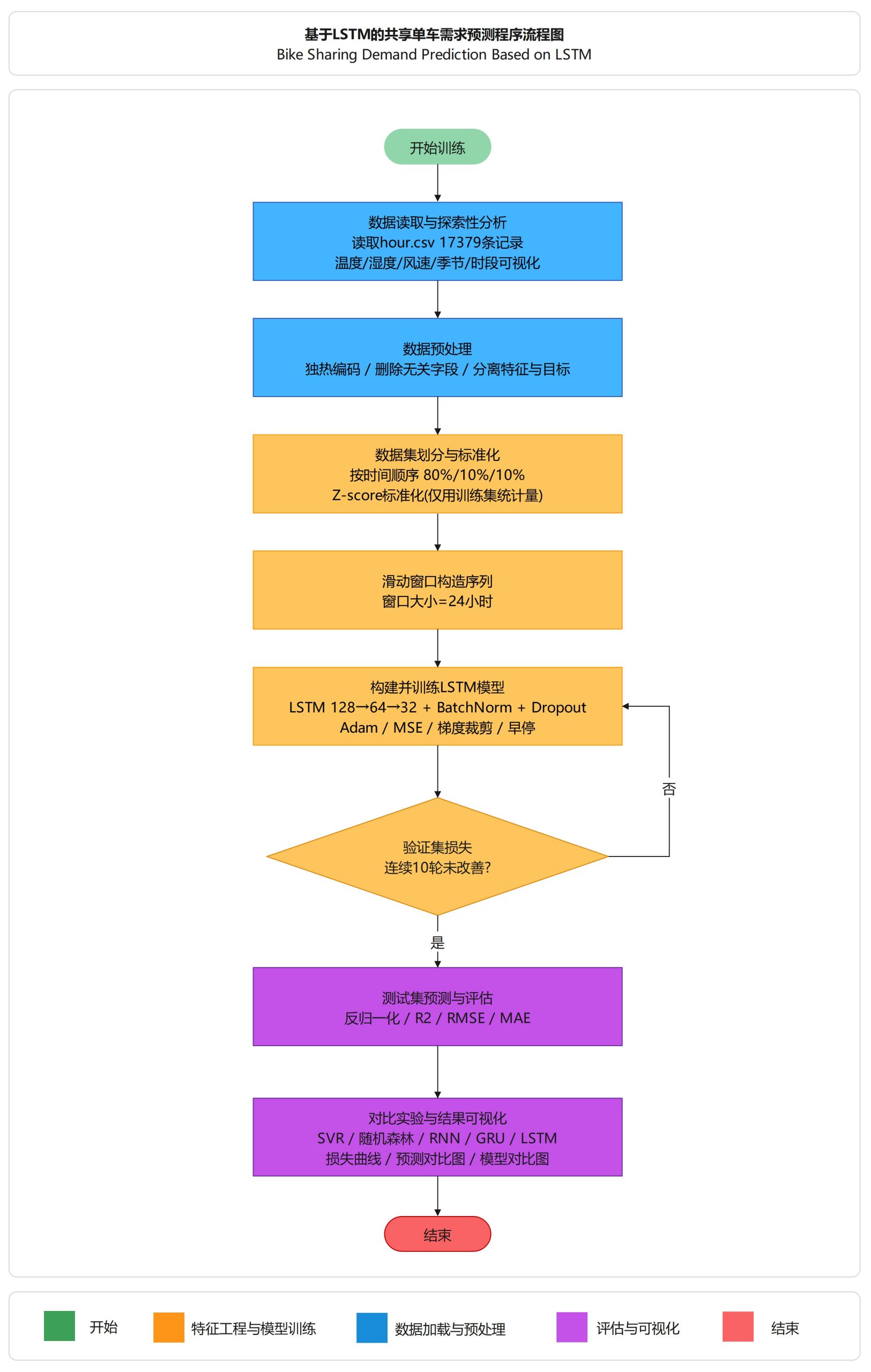 共享单车作为城市绿色出行的重要方式,其需求受天气、时段、季节等多因素影响且呈现复杂的非线性时序特征,准确预测骑行需求对运营商合理调度车辆、减少资源浪费具有重要意义,传统统计方法难以捕捉长期时序依赖关系,而LSTM凭借其门控机制在时间序列建模上具有天然优势,因此本项目采用LSTM构建共享单车需求预测模型。