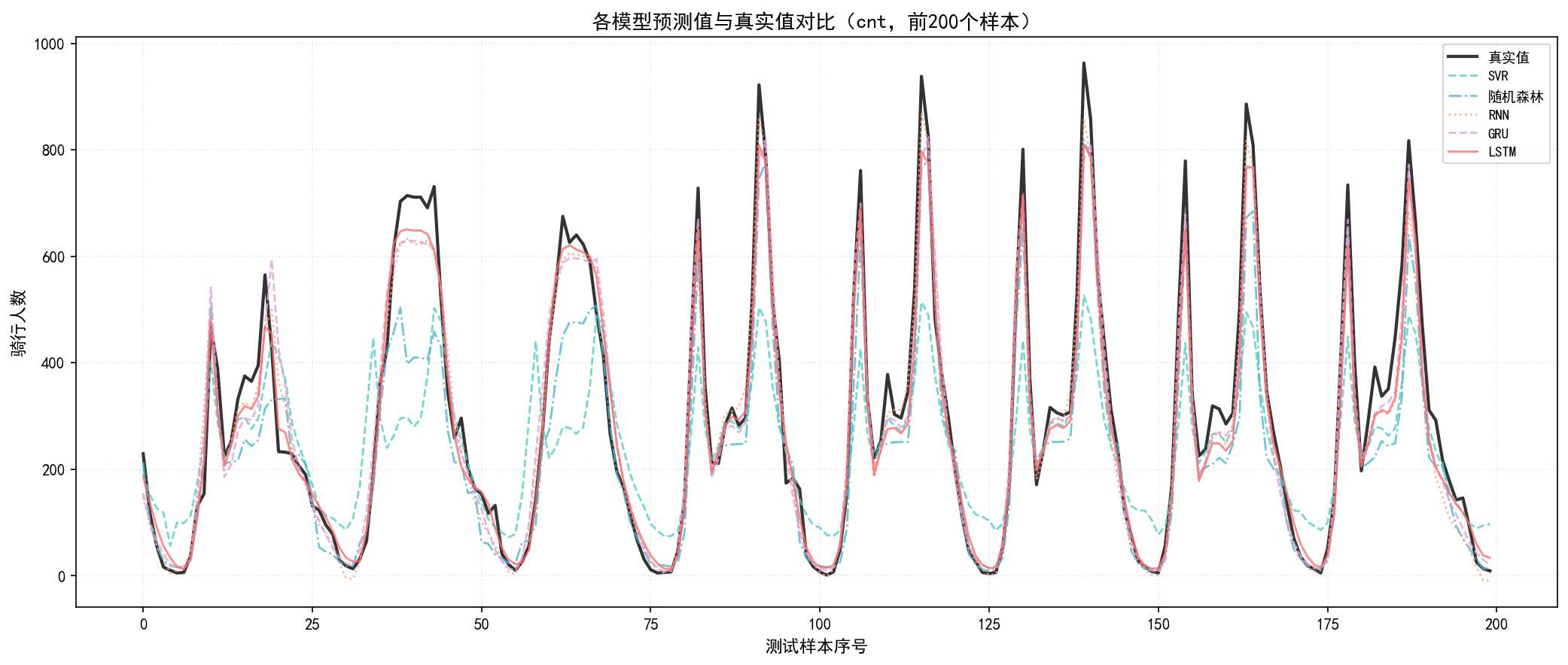 基于PyTorch构建LSTM模型,利用24小时滑动窗口对共享单车骑行需求进行时序预测,并与SVR、随机森林、RNN、GRU进行对比实验。