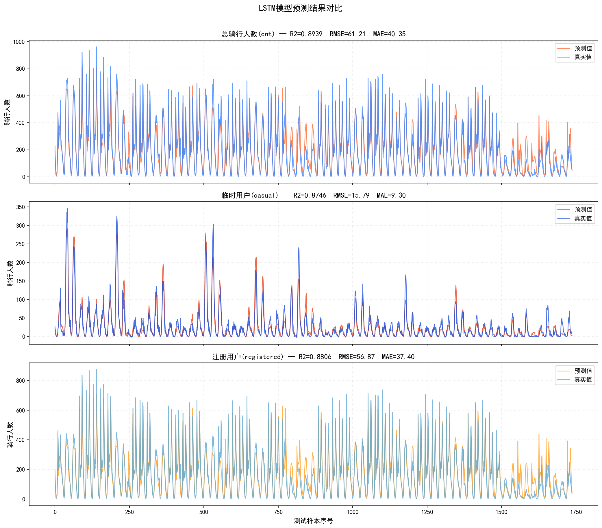 实验结果表明,LSTM模型在总骑行人数预测上取得了R2=0.8939、RMSE=61.21的最优表现,显著优于SVR(R2=0.5824)和随机森林(R2=0.7659)等传统机器学习方法,同时在临时用户和注册用户的预测上也均优于其他对比模型。结果验证了LSTM在共享单车需求时序预测任务中的有效性和优越性。
