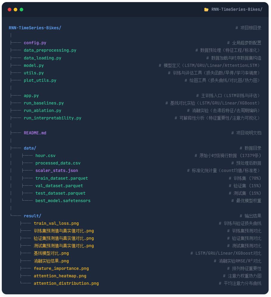 项目以config.py集中管理超参数,data_preprocessing.py完成列重命名、sin/cos周期编码、log1p变换、滞后特征构造和StandardScaler标准化,data_loading.py按时间顺序划分数据集并构造96小时滑动窗口的PyTorch时序数据集,model.py定义LSTM、GRU、Linear和AttentionLSTM四种模型架构(均采用Embedding层处理类别特征),utils.py封装RMSE损失函数、训练循环、早停机制和ReduceLROnPlateau学习率调度,plot_utils.py提供损失曲线、预测对比、柱状图、特征重要性和注意力热力图等可视化函数。