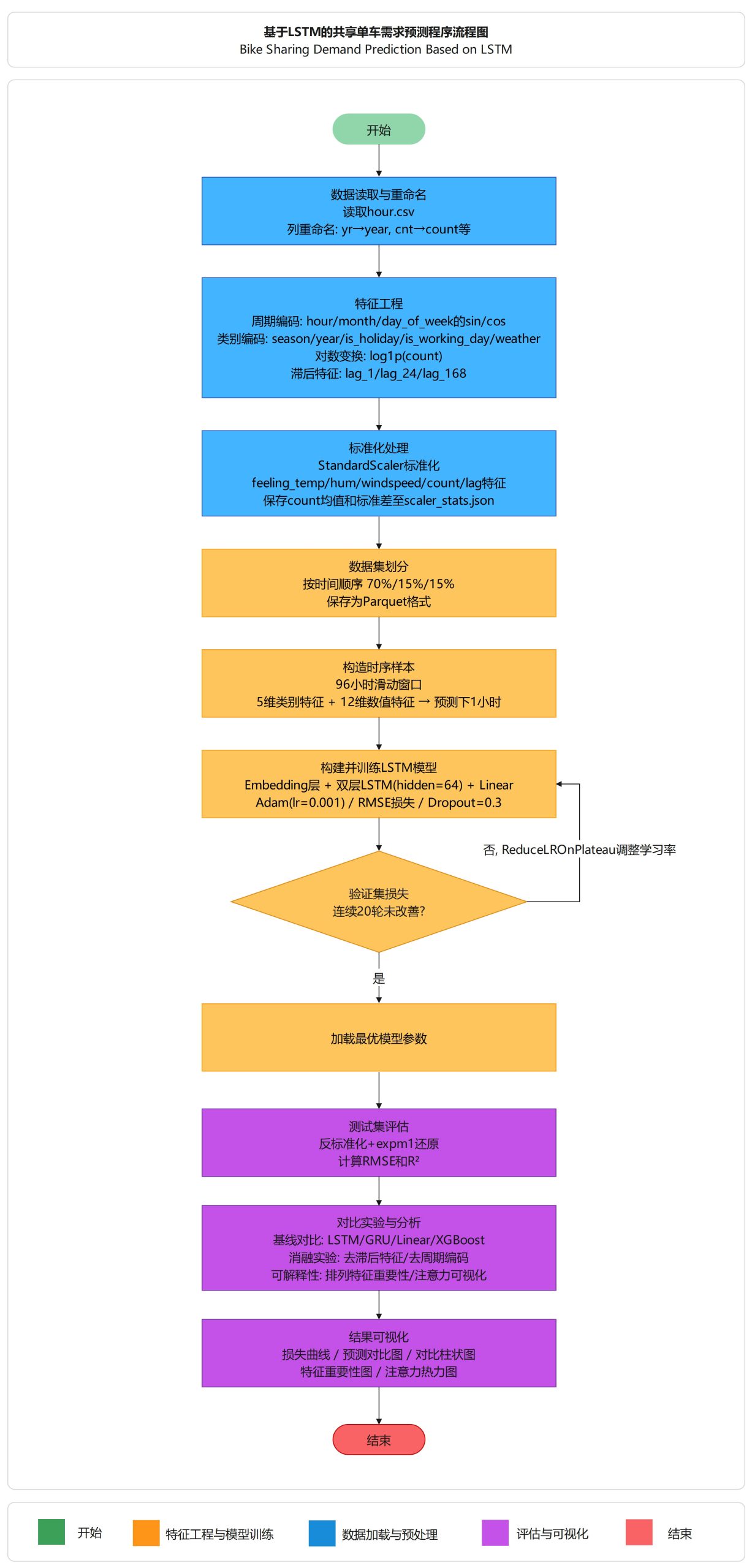 本项目基于PyTorch构建共享单车逐小时需求预测系统,以双层LSTM为主模型,采用sin/cos周期编码、1/24/168小时三级滞后特征和Embedding类别编码作为输入,通过RMSE损失、Adam优化器、ReduceLROnPlateau学习率调度和早停机制进行训练,并系统开展了LSTM/GRU/Linear/XGBoost四模型基线对比、滞后特征与周期编码消融实验、排列特征重要性和Bahdanau注意力可视化三组分析,验证了模型的有效性与可解释性。
