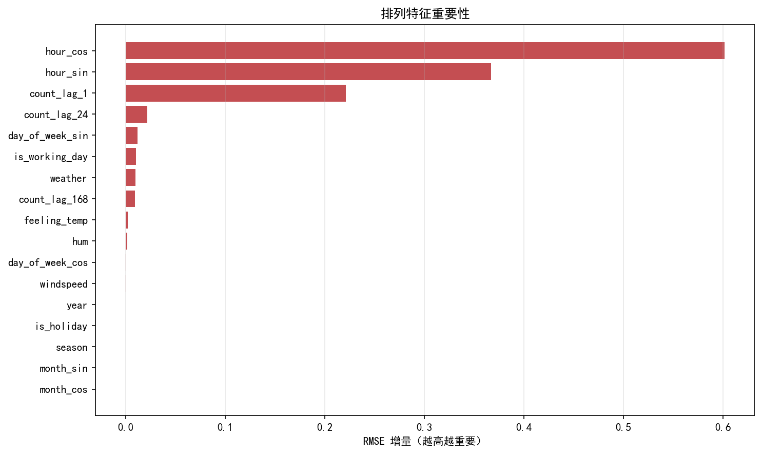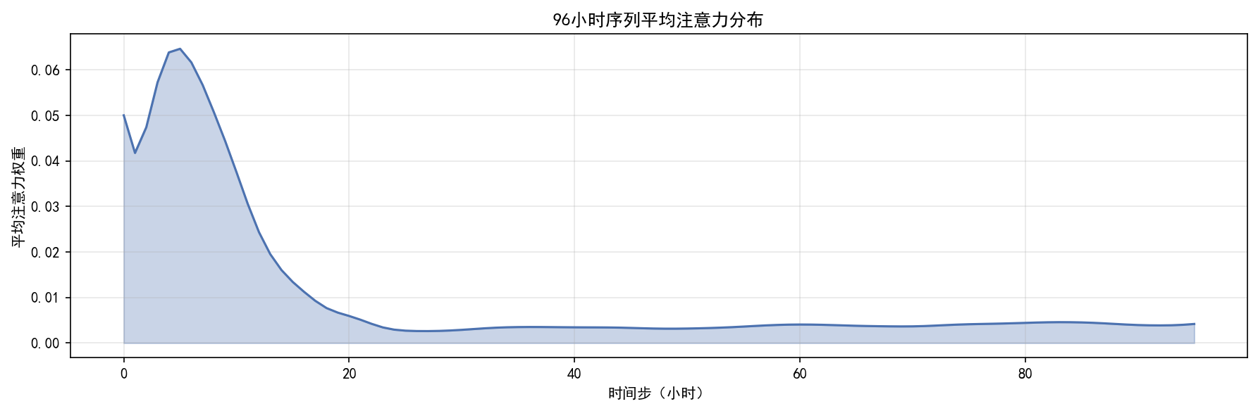实验结果表明,GRU取得了最优性能(RMSE=0.1962,R²=0.9351),LSTM次之(R²=0.9107),两者均显著优于XGBoost(R²=0.8991)和线性基线(R²=0.5382),验证了循环神经网络在时序建模上的优势。消融实验显示,移除滞后特征后R²从0.9188降至0.8768,移除周期编码后降至0.9010,证实两组特征提供了互补的预测信息。排列特征重要性分析发现hour_cos和hour_sin的RMSE增量远超其他特征,表明小时周期是需求波动的核心驱动因素;注意力权重热力图显示模型将注意力集中在最近约20个时间步,符合短期需求预测依赖近期历史的直觉。