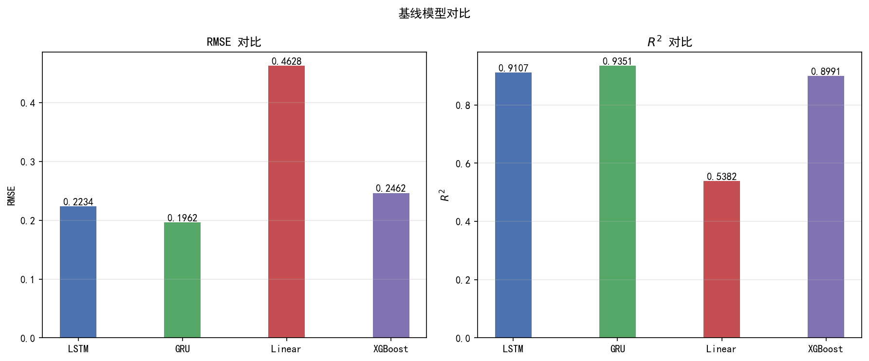 所有实验结果(损失曲线、预测对比图、基线模型对比、消融实验结果、特征重要性、注意力热力图等共9张图表)保存在result/目录下,最优模型权重保存为data/best_model.safetensors。