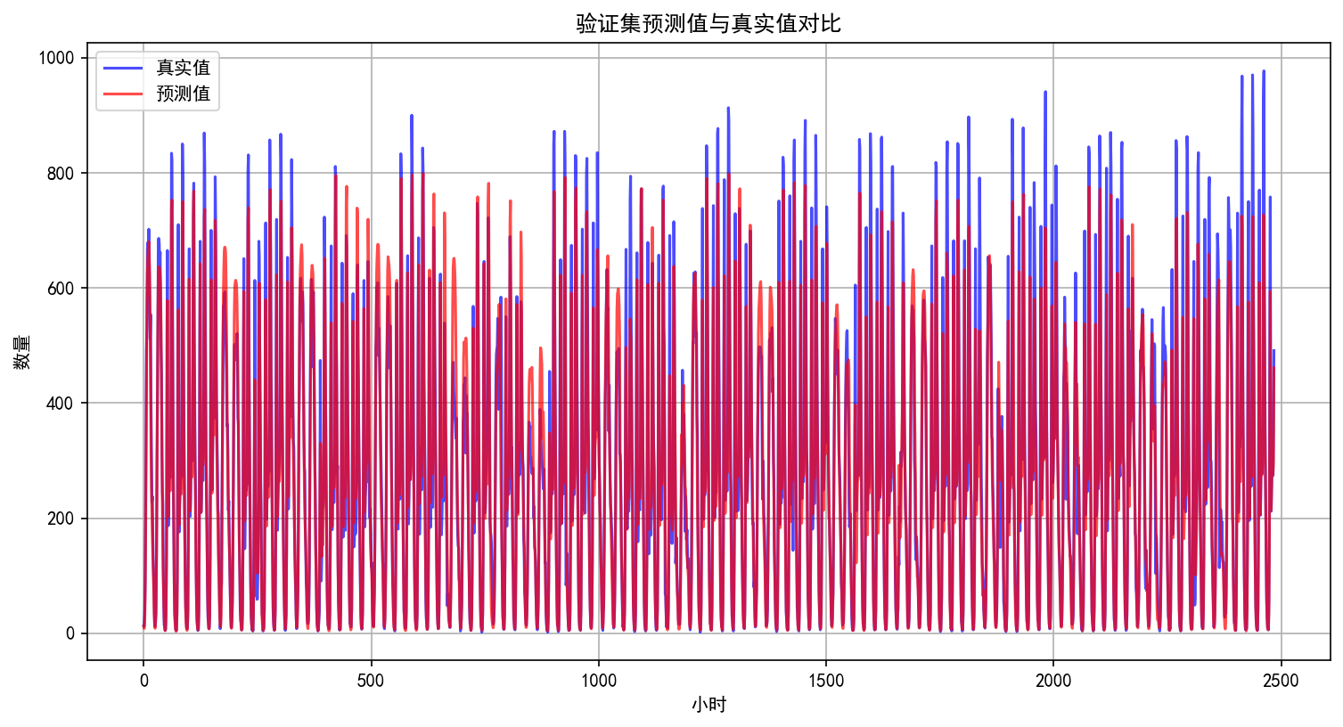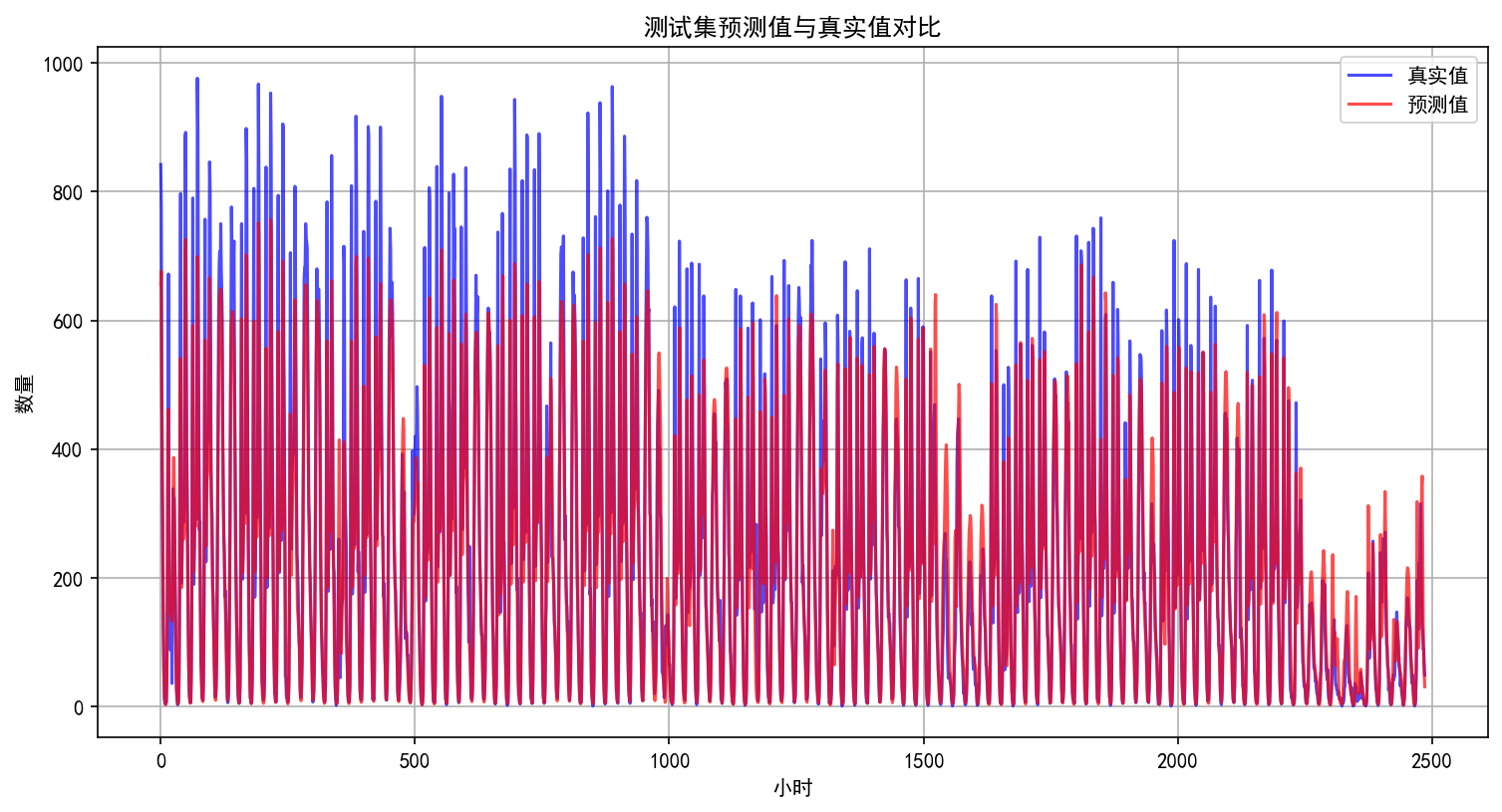 基于LSTM神经网络,利用华盛顿特区共享单车历史数据,通过时序特征工程和滑动窗口建模实现小时级租赁需求预测。