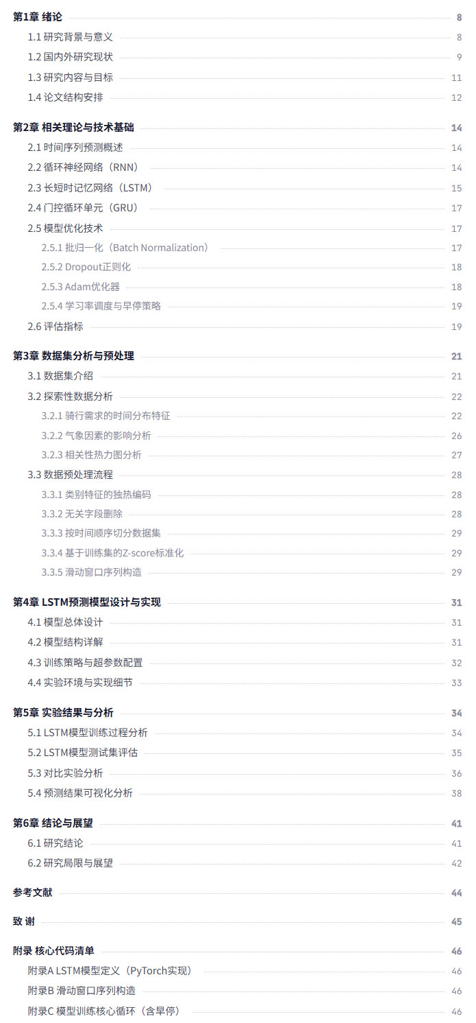 本文以UCI机器学习库中的华盛顿特区共享单车数据集为研究对象,对2011年至2012年间按小时记录的17379条骑行数据进行深入分析和建模。通过独热编码、标准化处理和滑动窗口序列构造等预处理操作,构建并训练三层堆叠的LSTM模型,结合批归一化、Dropout正则化、Adam优化器、学习率自适应调度以及早停策略进行系统优化。