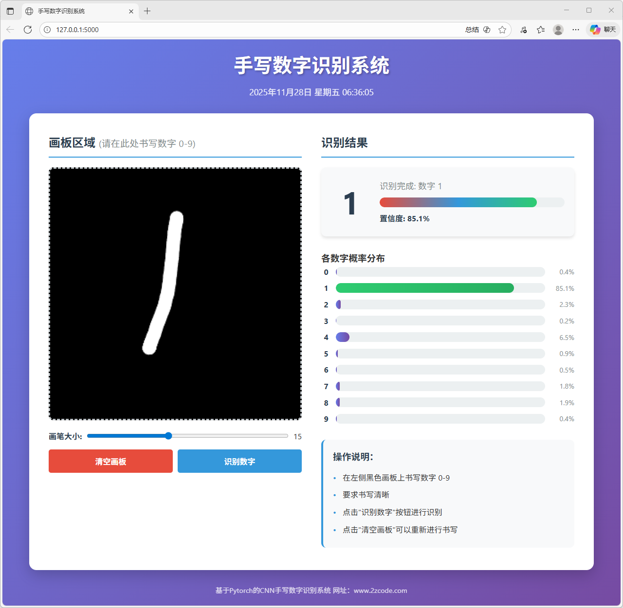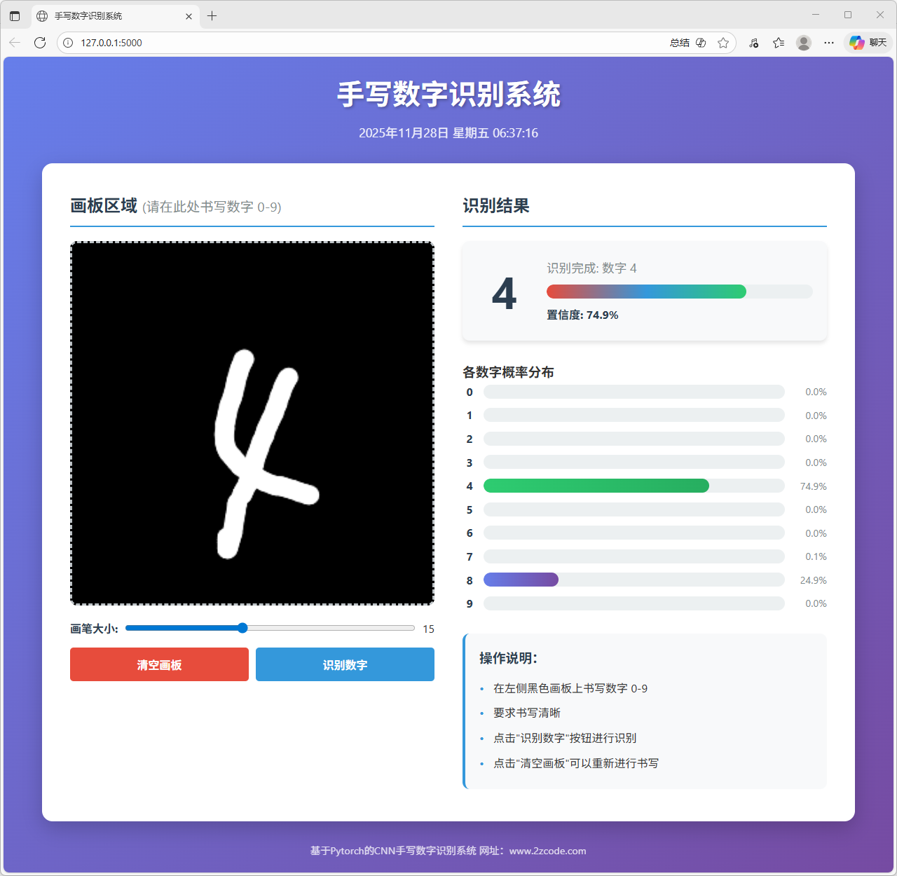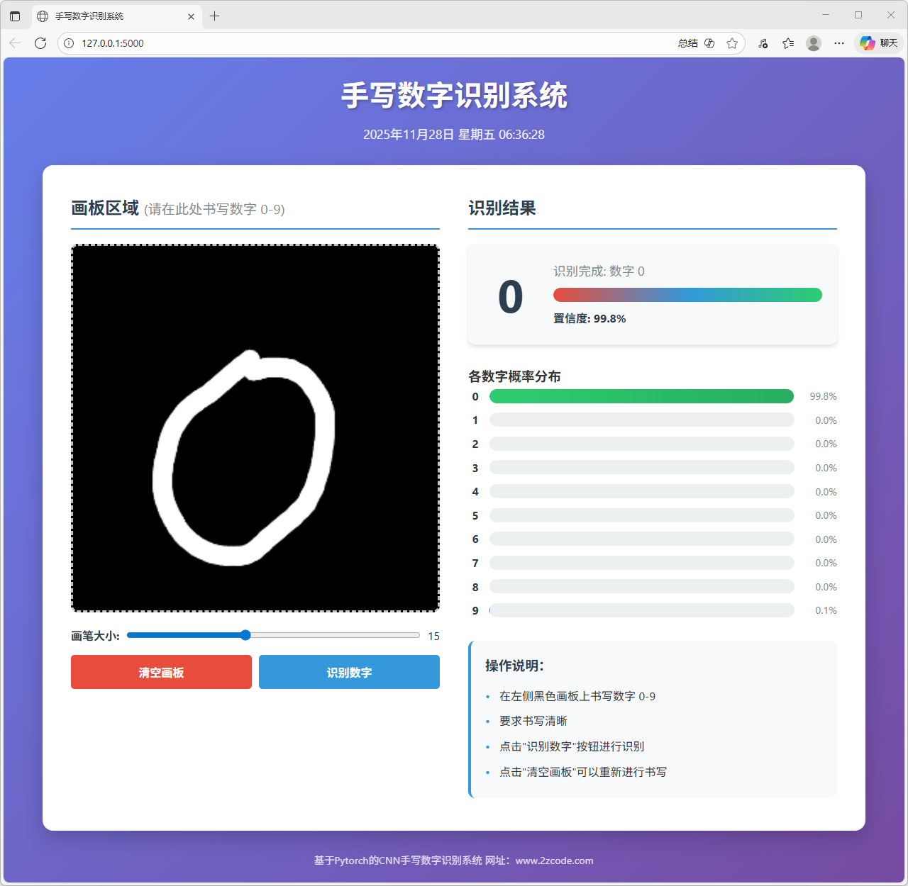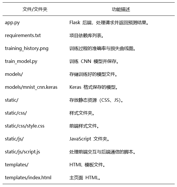 本文以手写数字识别为研究对象,完成了一个基于卷积神经网络的识别模型训练与网页端部署系统。系统整体包含模型训练与在线推理两部分,旨在实现从数据学习到交互式应用的完整流程。