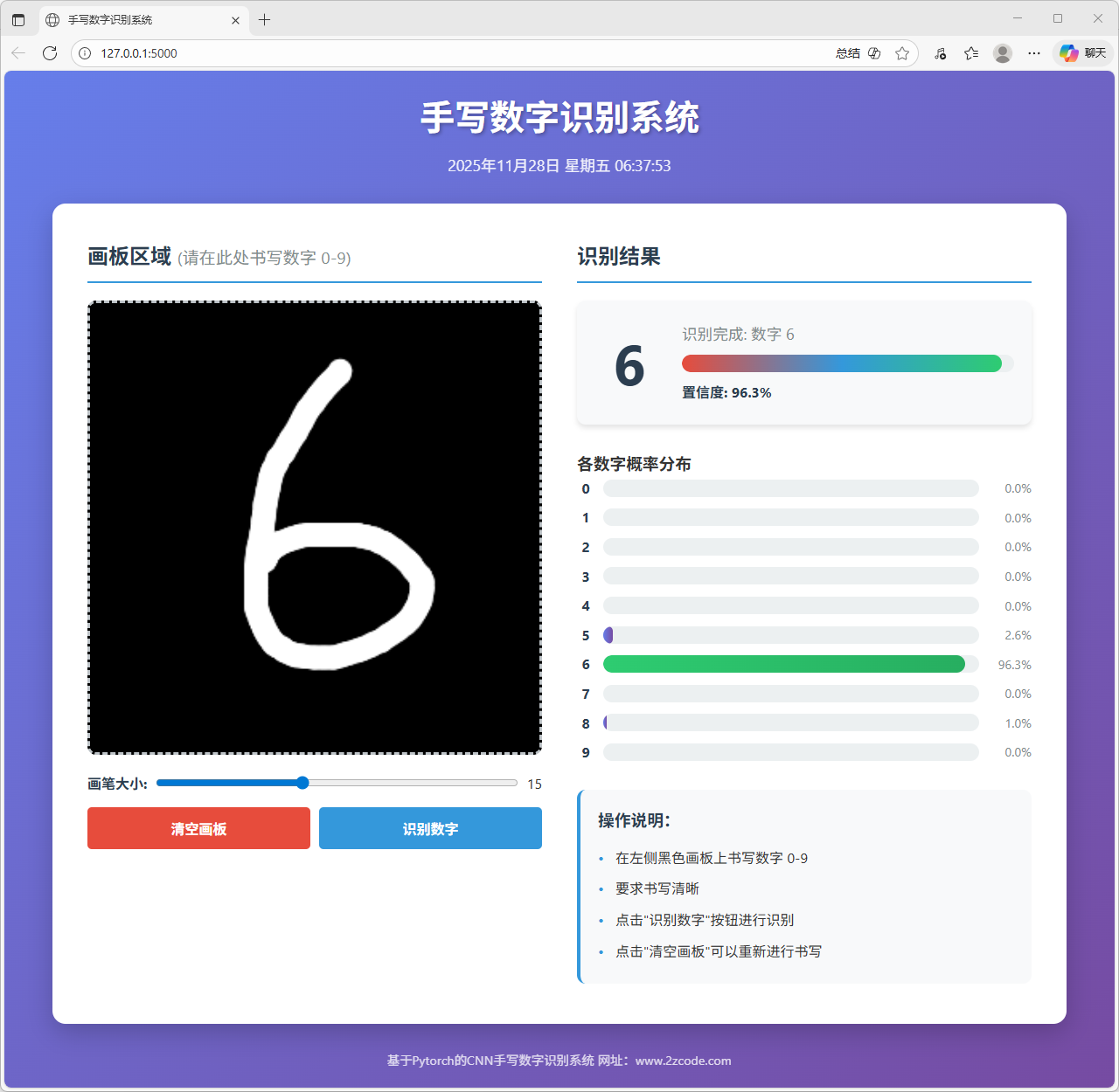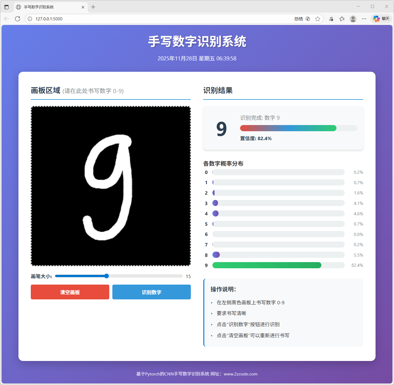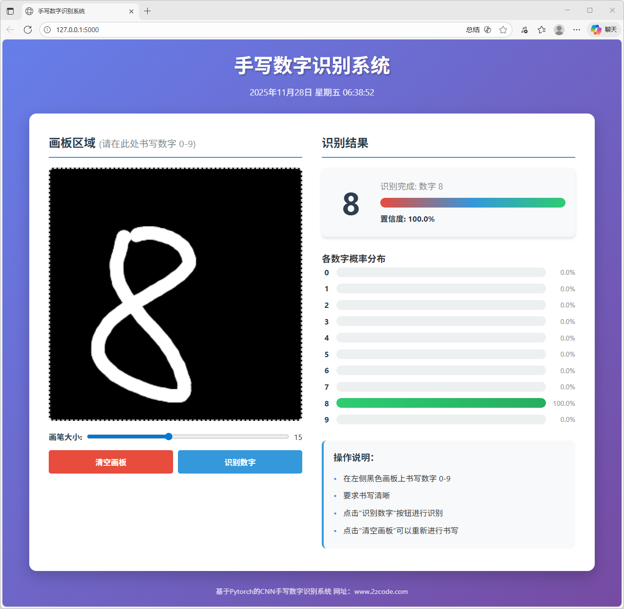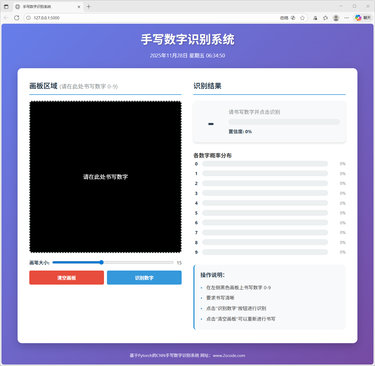 本文以手写数字识别为研究对象,完成了一个基于卷积神经网络的识别模型训练与网页端部署系统。系统整体包含模型训练与在线推理两部分,旨在实现从数据学习到交互式应用的完整流程。