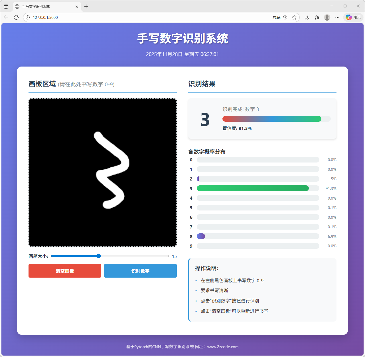 系统采用 PyTorch 训练 MNISTCNN 模型并保存权重,结合 Flask 搭建在线推理服务,通过前端画布采集手写输入、后端一致化预处理与模型预测,实现手写数字的实时识别与结果展示。