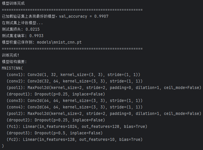 从日志可见模型在验证集上达到约 99.07% 的最佳准确率、测试集准确率约 99.33% 且损失很低,说明训练充分收敛并具有良好泛化能力。