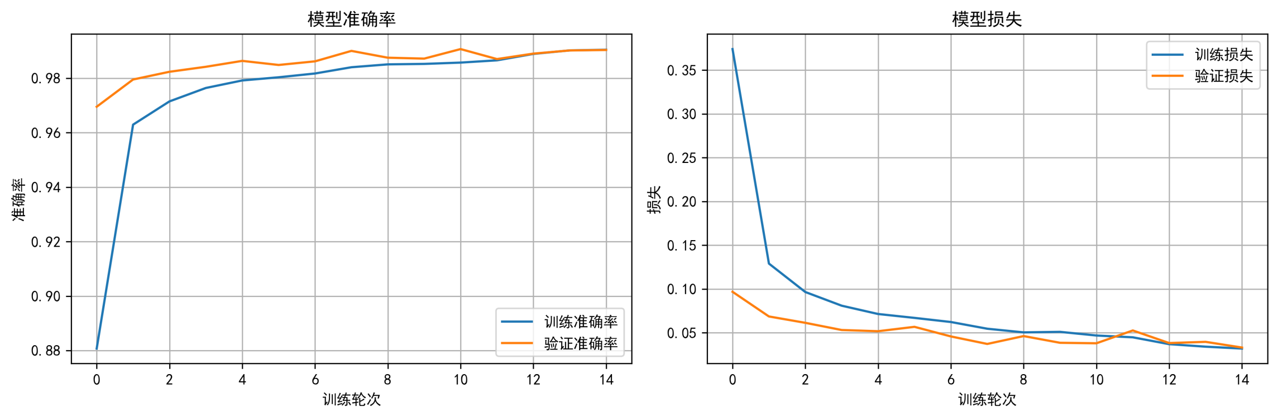 该图展示了 MNISTCNN 在训练过程中训练集与验证集的准确率逐步上升、损失持续下降并趋于稳定,表明模型有效收敛且无明显过拟合。