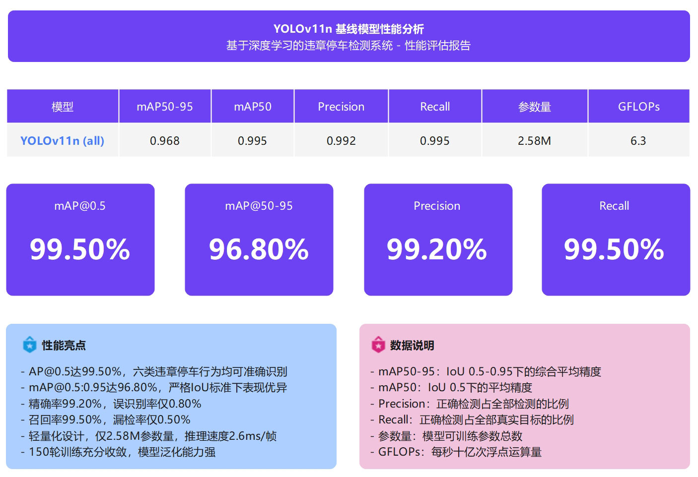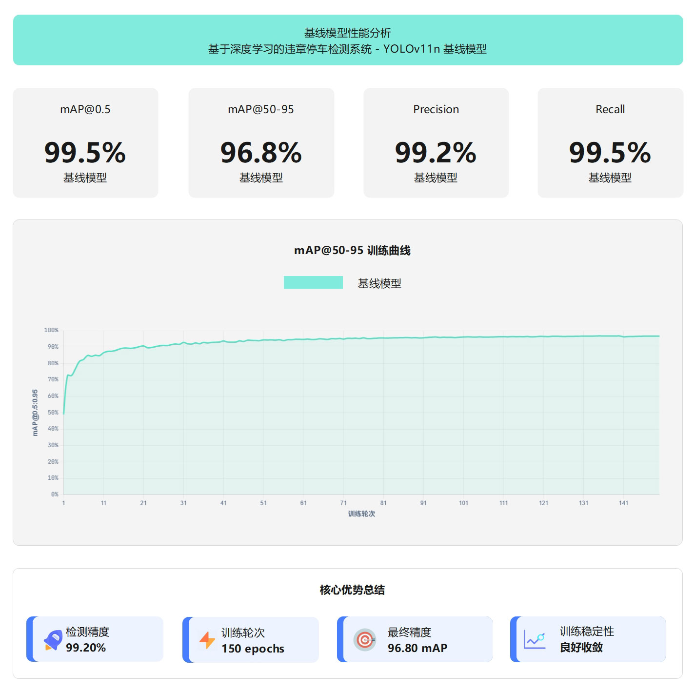 YOLO11n基线模型在违章停车检测任务上表现出色,经过150轮训练后,在462张验证集上达到99.5% mAP@0.5和96.8% mAP@0.5:0.95的检测精度。模型的精确率为99.2%,召回率为99.5%,误识别率和漏检率均控制在1%以内,能够满足实际应用需求。