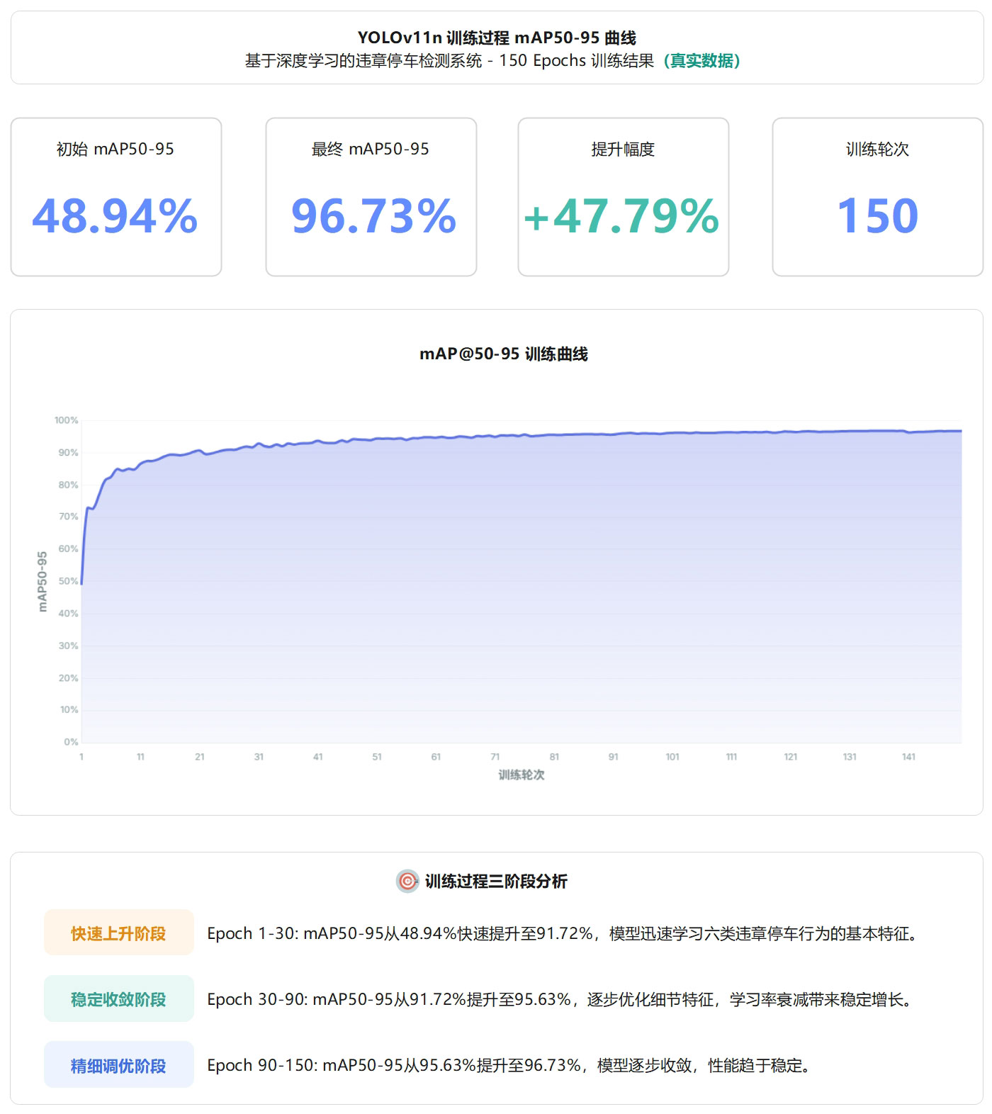 该曲线展示了模型在违章停车检测任务上的学习能力和收敛特性,验证了训练策略的有效性。最终96.73% mAP@0.5:0.95配合99.5% mAP@0.5,表明模型在严格评估标准下仍保持优异性能。
