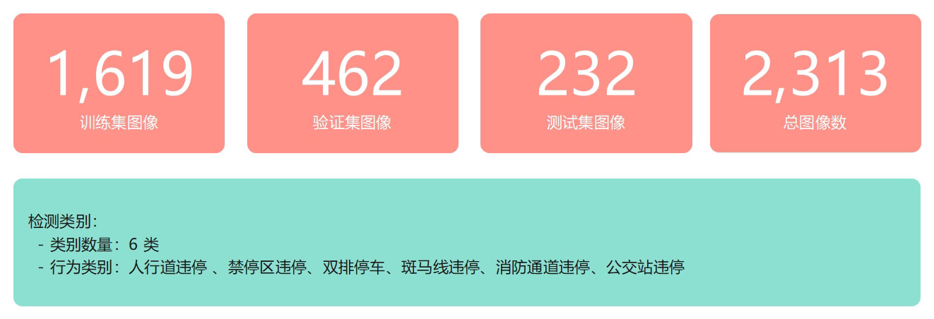 本研究使用的是违章停车检测数据集,该数据集专门针对城市道路场景中车辆的不同违停行为进行标注。数据集包含城市主干道、支路、商业区、住宅区等多种道路场景下的图像,涵盖不同光照条件、不同拍摄角度和交通密度,包含6个违章停车类别(人行道违停、禁停区违停、双排停车、斑马线违停、消防通道违停、公交站违停),具有较强的场景多样性和实用价值。数据集共包含2,313张高质量标注图像(6,606个标注框),按照约7:2:1的比例划分为训练集(1,619张)、验证集(462张)和测试集(232张),为模型训练和评估提供了充足的数据支撑。。