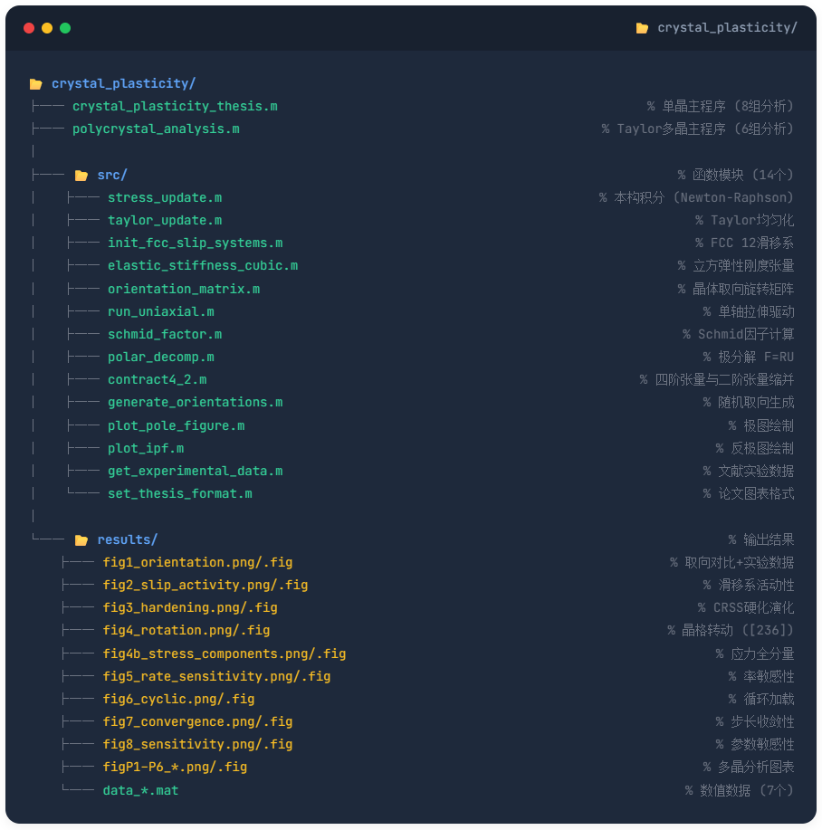 项目含2个主脚本(单晶/多晶)、src/下14个函数(本构积分、均匀化、初始化、可视化等)、results/输出目录。