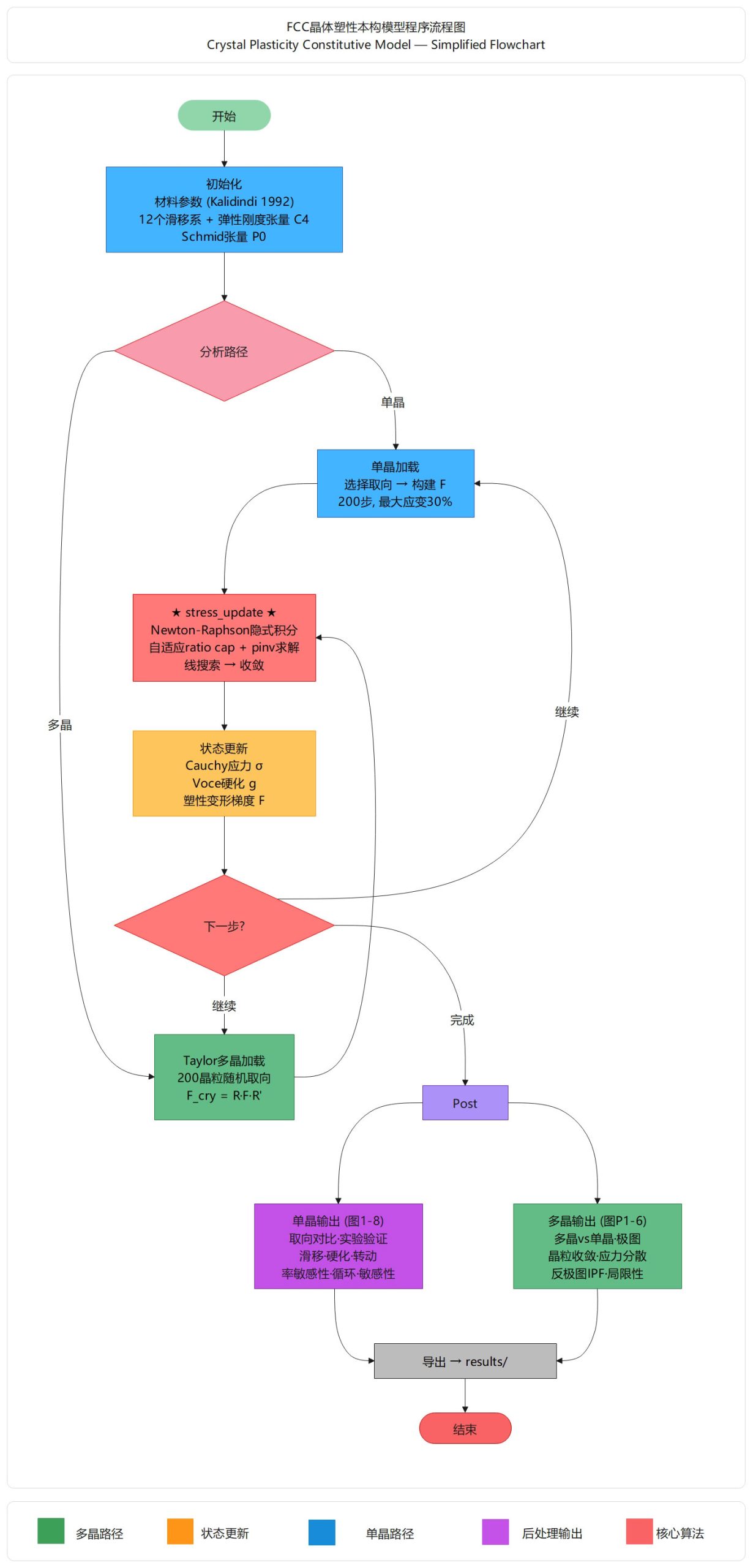 本项目基于MATLAB实现了FCC金属(铜单晶)晶体塑性有限变形本构模型的完整数值模拟框架,采用变形梯度乘法分解F=Fe·Fp、率相关 幂律流动律和Voce饱和硬化模型,通过Newton-Raphson隐式积分求解本构方程,并在此基础上实现了Taylor等应变多晶均匀化模型;单 晶部分涵盖取向依赖性、滑移系活动性、硬化演化、晶格转动、率敏感性、循环加载和参数敏感性共8组分析,多晶部分包括织构极图 、反极图、晶粒数收敛性和应力分散度共6组分析,材料参数取自Simmons & Wang(1971)和Kalidindi et al.(1992),模拟结果与文献实验数据吻合良好。