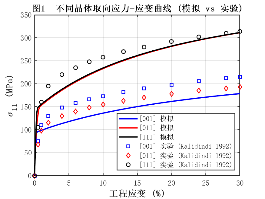 基于MATLAB实现FCC铜单晶晶体塑性有限变形本构模型(率相关幂律+Voce硬化+Newton-Raphson隐式积分)及Taylor多晶均匀化,完成取向依赖性、织构演化等14组数值分析并与文献实验数据验证。