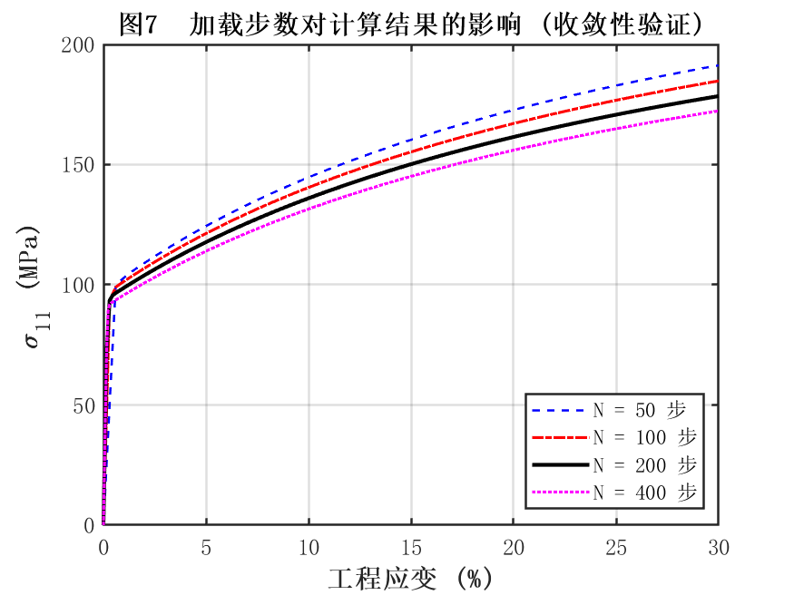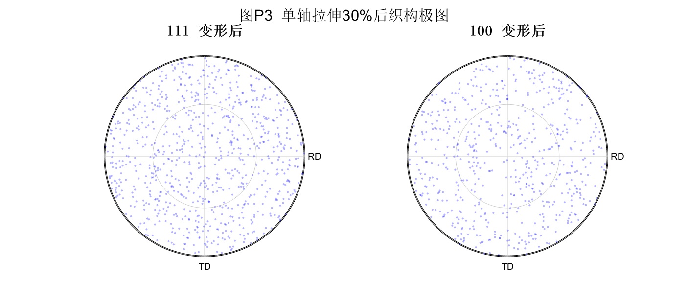 在多晶尺度上,采用Taylor均匀化模型(等应变假设)对200个随机取向晶粒的多晶铜进行了模拟。多晶应力-应变响应介于各单晶取向 之间,30%单轴拉伸后宏观应力达到272 MPa。通过{111}和{100}极图及拉伸方向反极图(IPF)分析了织构演化,变形后晶粒取向明显 向[001]和[111]稳定取向聚集,符合FCC金属单轴拉伸的典型织构特征。晶粒数收敛性验证表明200个晶粒即可获得稳定的宏观响应。