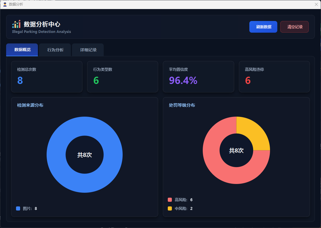 数据分析模块提供检测数据的可视化展示和统计分析功能,用户点击”数据分析”按钮打开独立的分析窗口,包含数据概览、行为分析、详细记录三个标签页,可查看检测总数、违停类型数、平均置信度、高风险违停数等关键指标,通过条形图展示四类违章停车行为分布、饼图展示检测来源(图片/视频/实时)和处罚等级(一般违停/严重违停)分布,支持查询最近50条历史检测记录(存储在SQLite数据库data/app.db)、清空当前用户记录等操作,实现检测数据的持久化存储和全面分析。