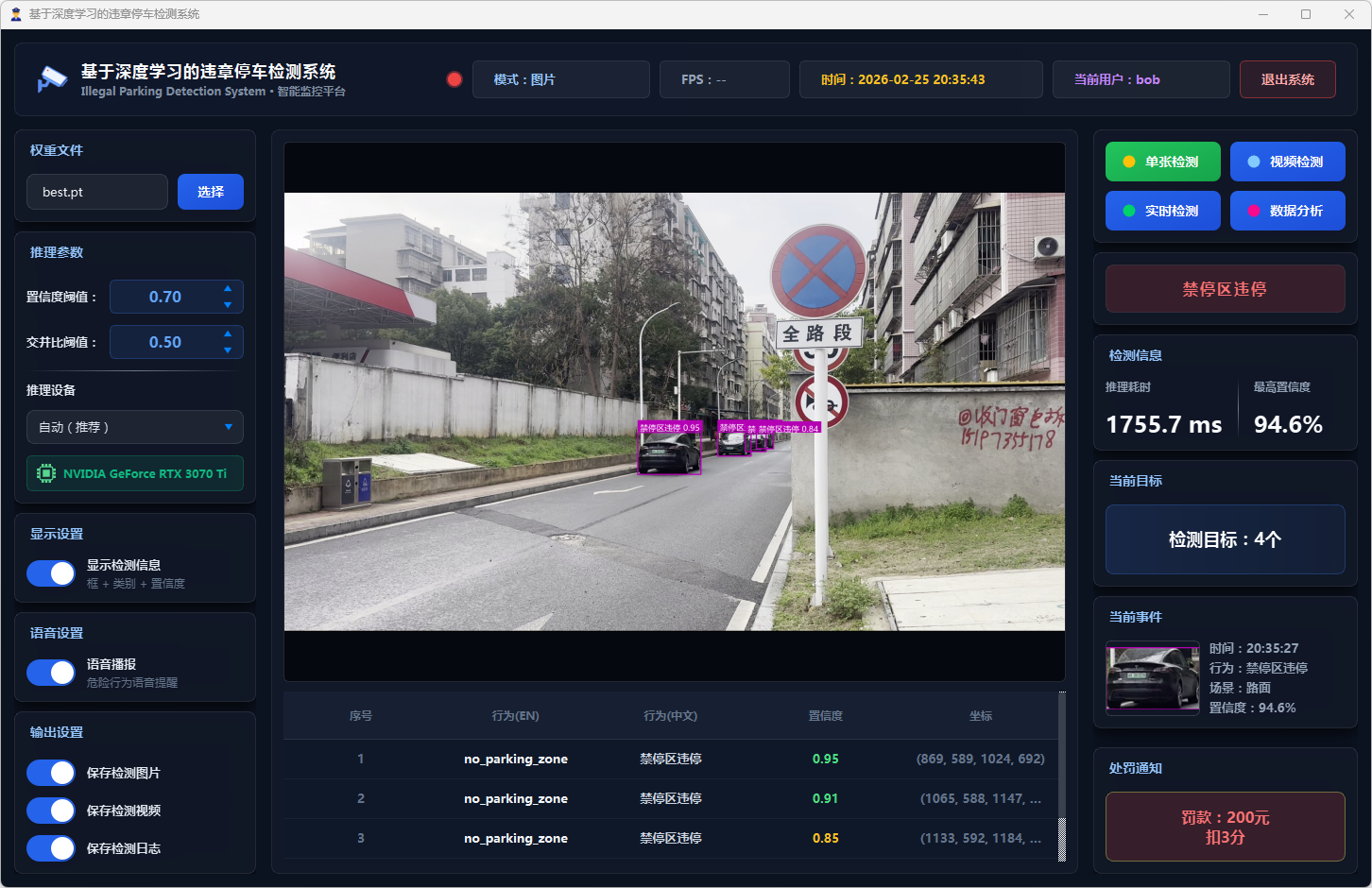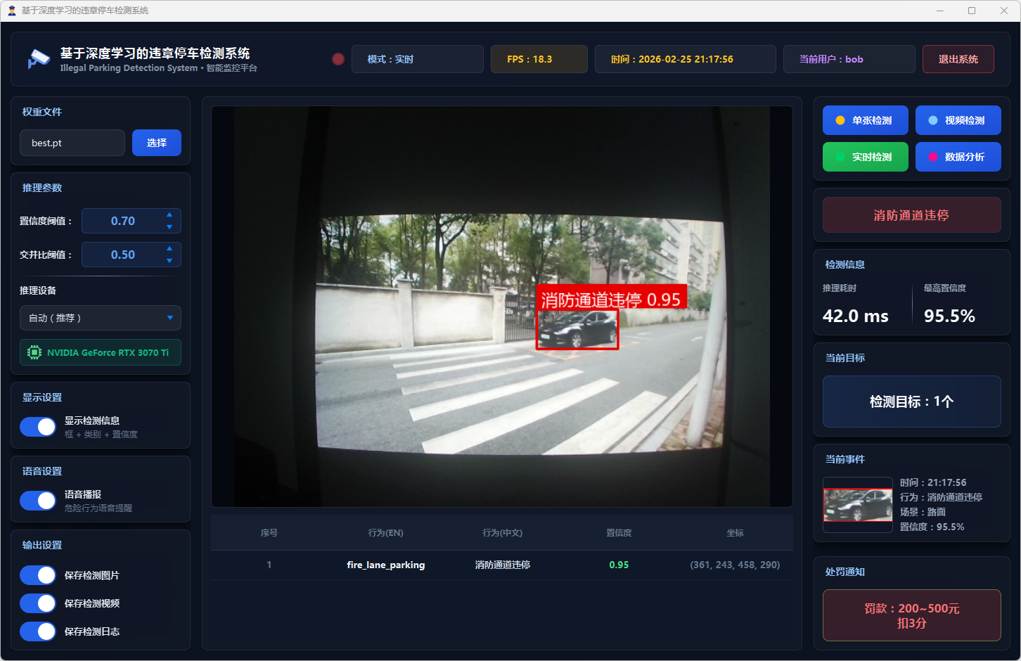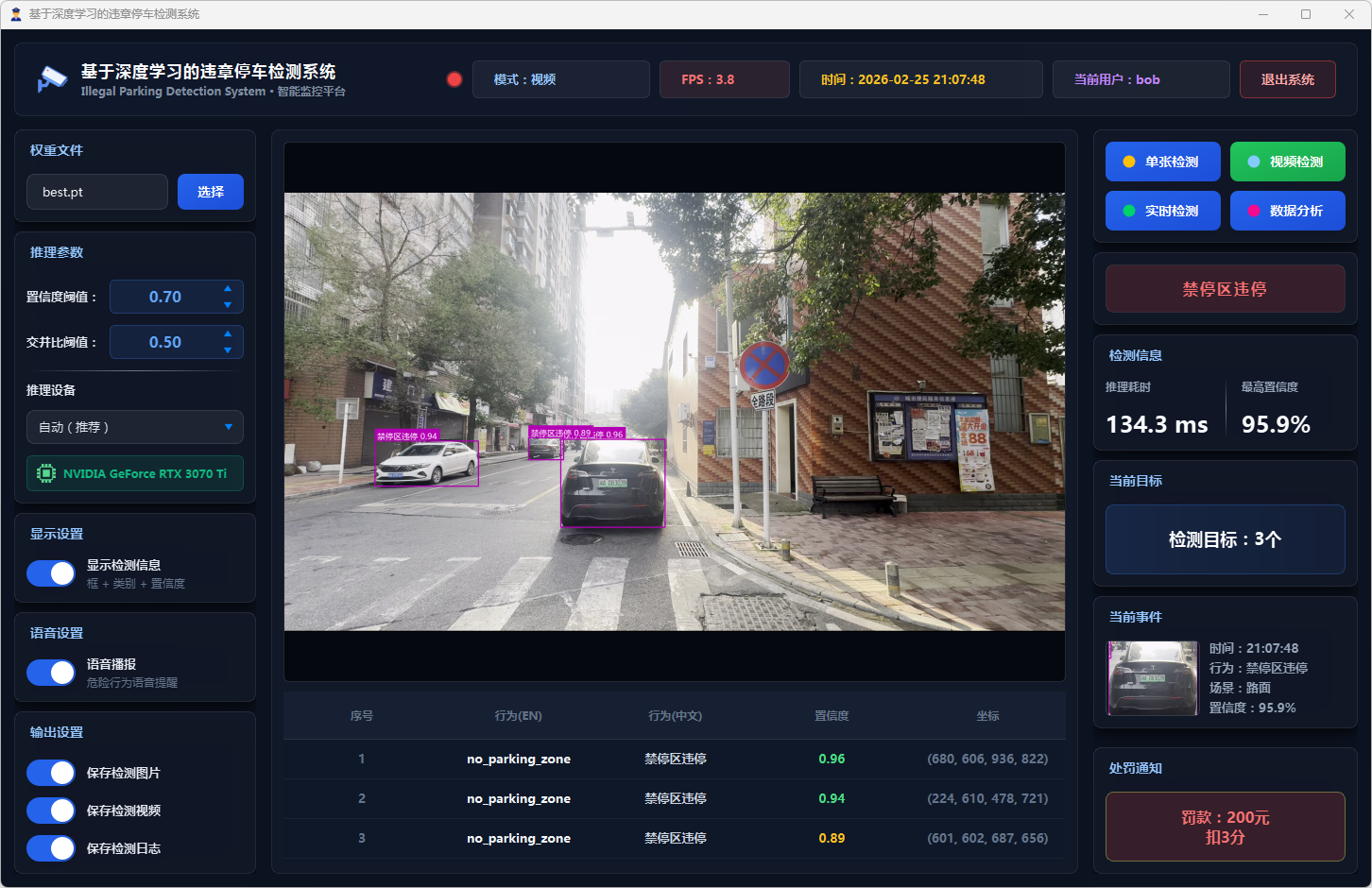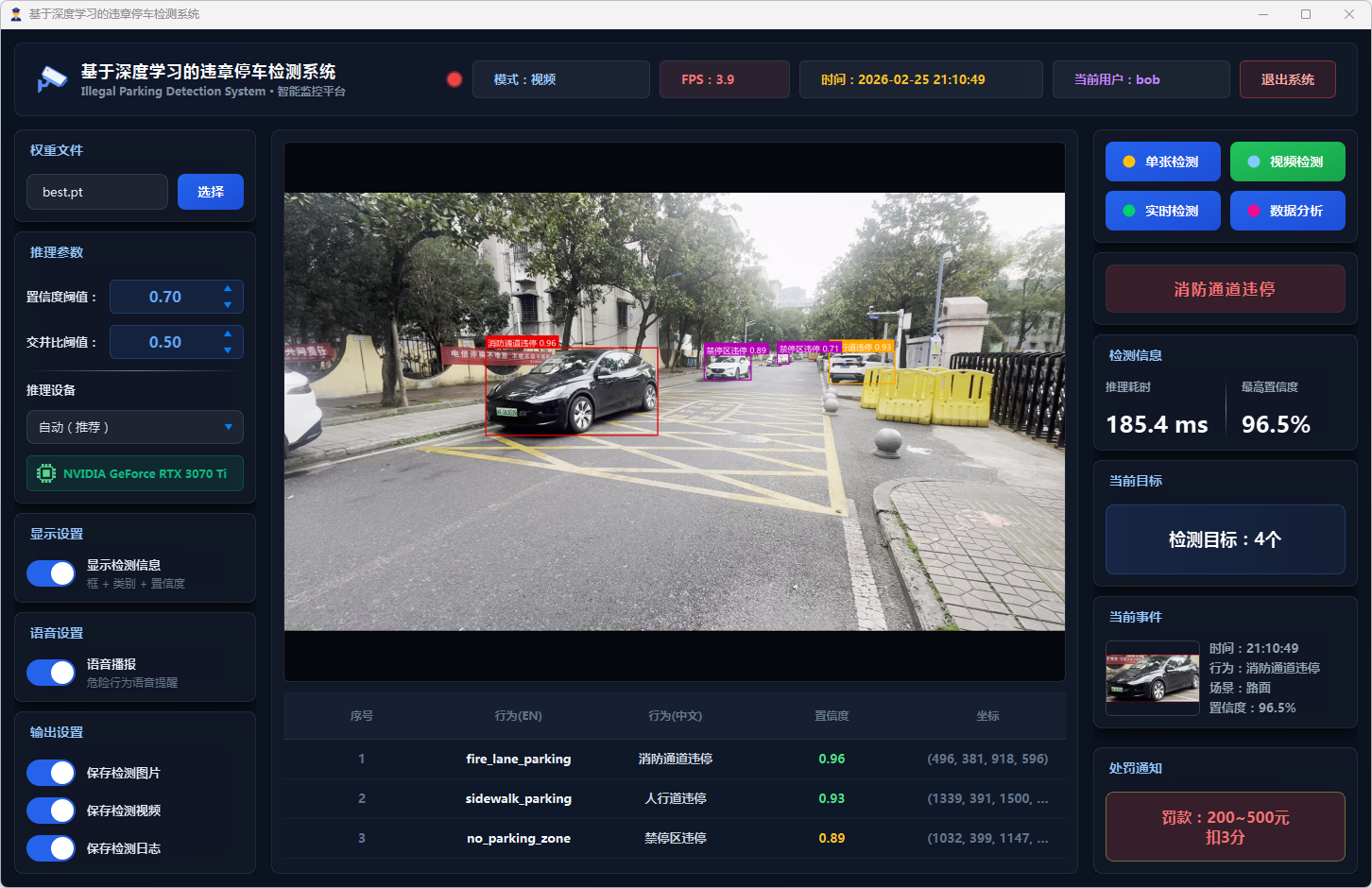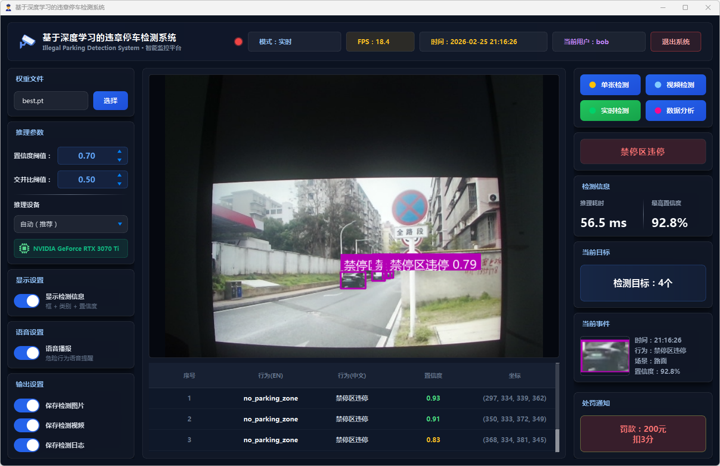 在系统设计层面,本文基于PySide6框架开发了功能完备的可视化检测平台,支持图片、视频文件及实时摄像头三种输入模式。系统设计了多级风险评估机制,依据违停类型将风险划分为一般违停与严重违停两个等级;引入连续三帧确认的稳定检测策略以抑制误报;集成语音告警模块实现危险违停行为的实时播报;同时采用SQLite数据库实现用户管理与检测记录的持久化存储,并提供违章行为分布、风险等级统计、检测趋势分析等数据可视化功能。