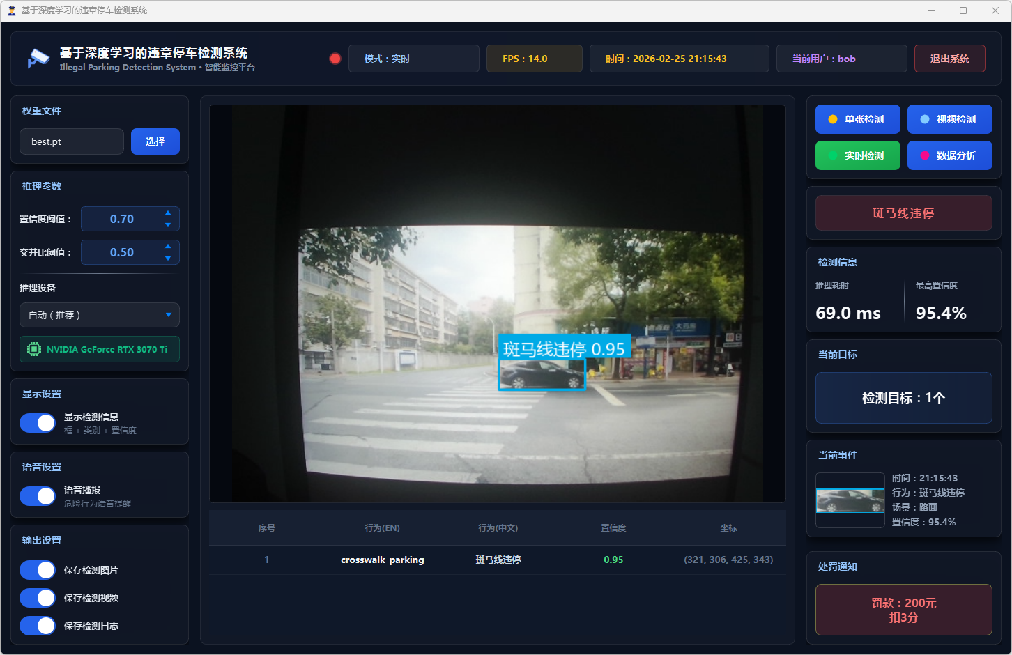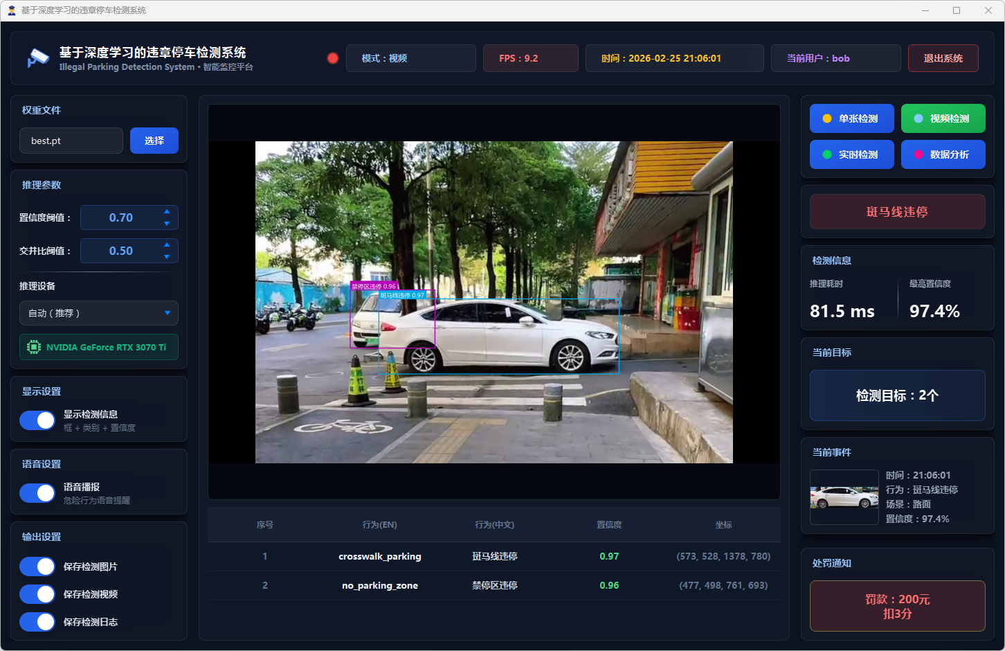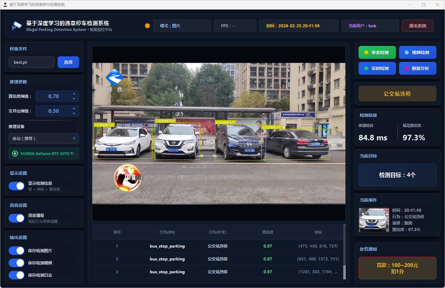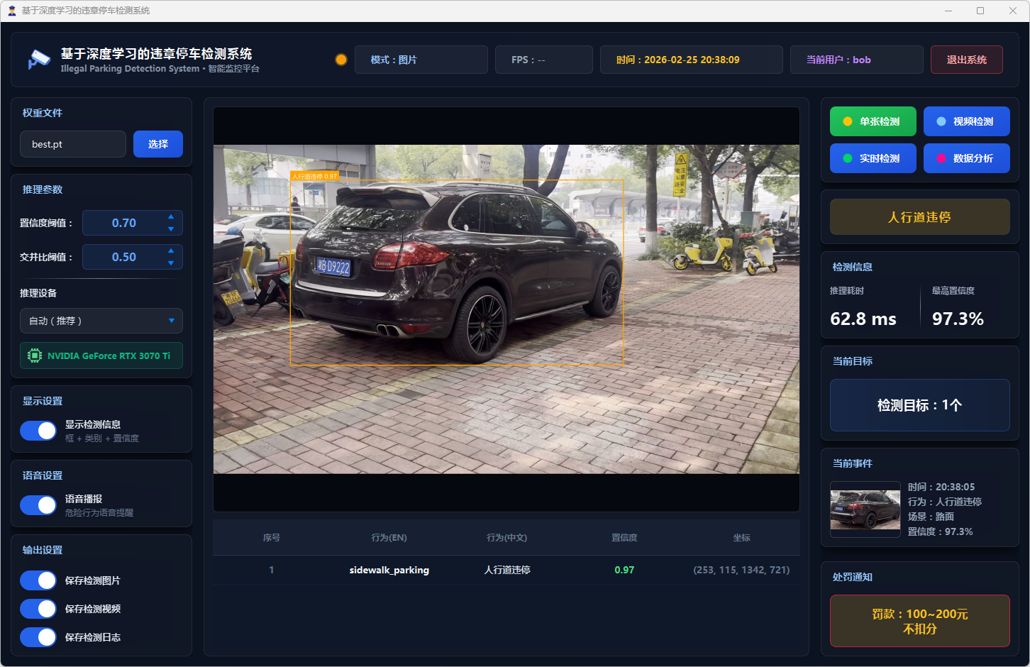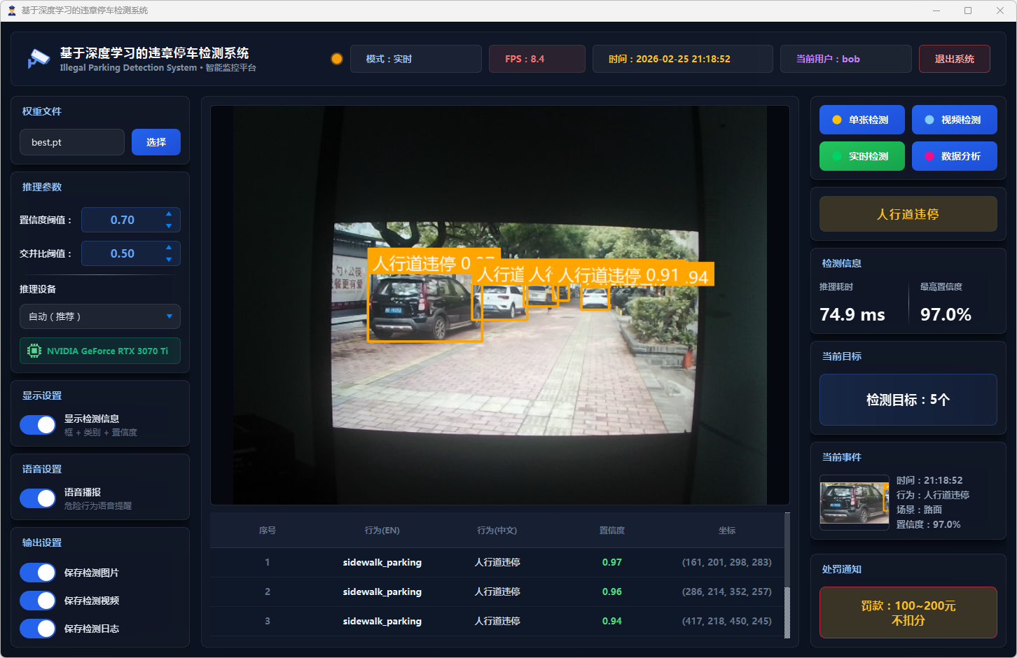 在系统设计层面,本文基于PySide6框架开发了功能完备的可视化检测平台,支持图片、视频文件及实时摄像头三种输入模式。系统设计了多级风险评估机制,依据违停类型将风险划分为一般违停与严重违停两个等级;引入连续三帧确认的稳定检测策略以抑制误报;集成语音告警模块实现危险违停行为的实时播报;同时采用SQLite数据库实现用户管理与检测记录的持久化存储,并提供违章行为分布、风险等级统计、检测趋势分析等数据可视化功能。