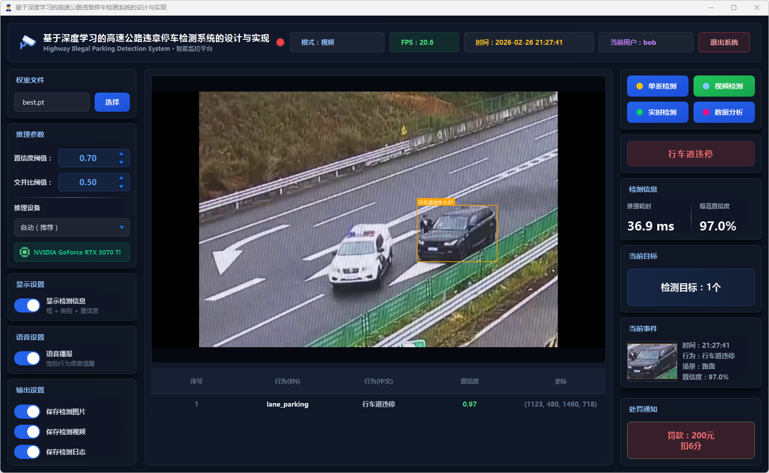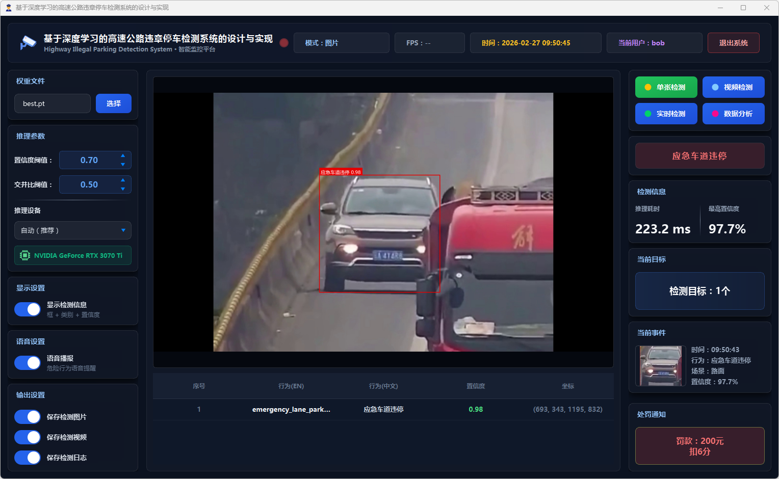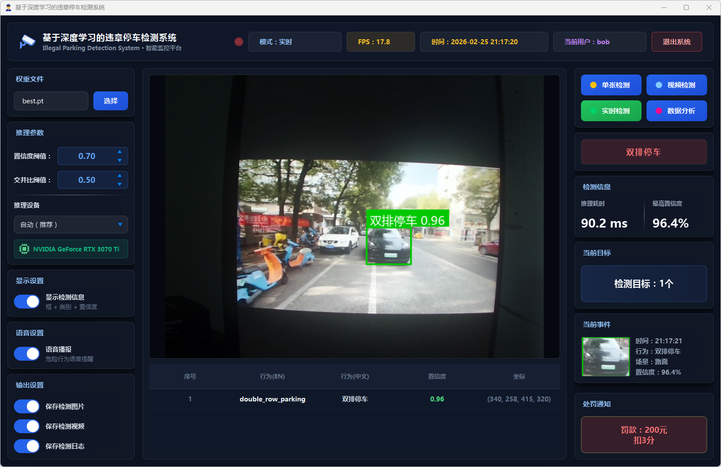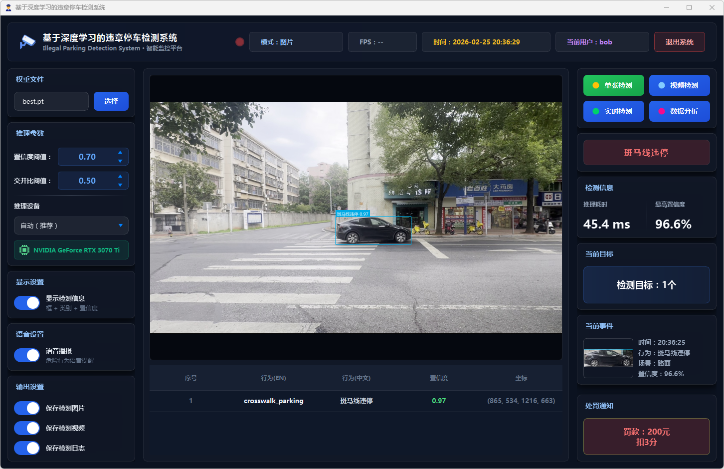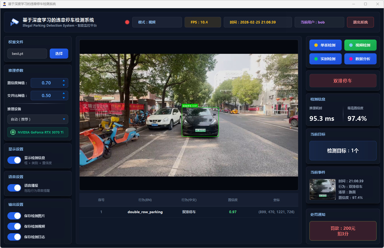 在系统设计层面,本文基于PySide6框架开发了功能完备的可视化检测平台,支持图片、视频文件及实时摄像头三种输入模式。系统设计了多级风险评估机制,依据违停类型将风险划分为一般违停与严重违停两个等级;引入连续三帧确认的稳定检测策略以抑制误报;集成语音告警模块实现危险违停行为的实时播报;同时采用SQLite数据库实现用户管理与检测记录的持久化存储,并提供违章行为分布、风险等级统计、检测趋势分析等数据可视化功能。