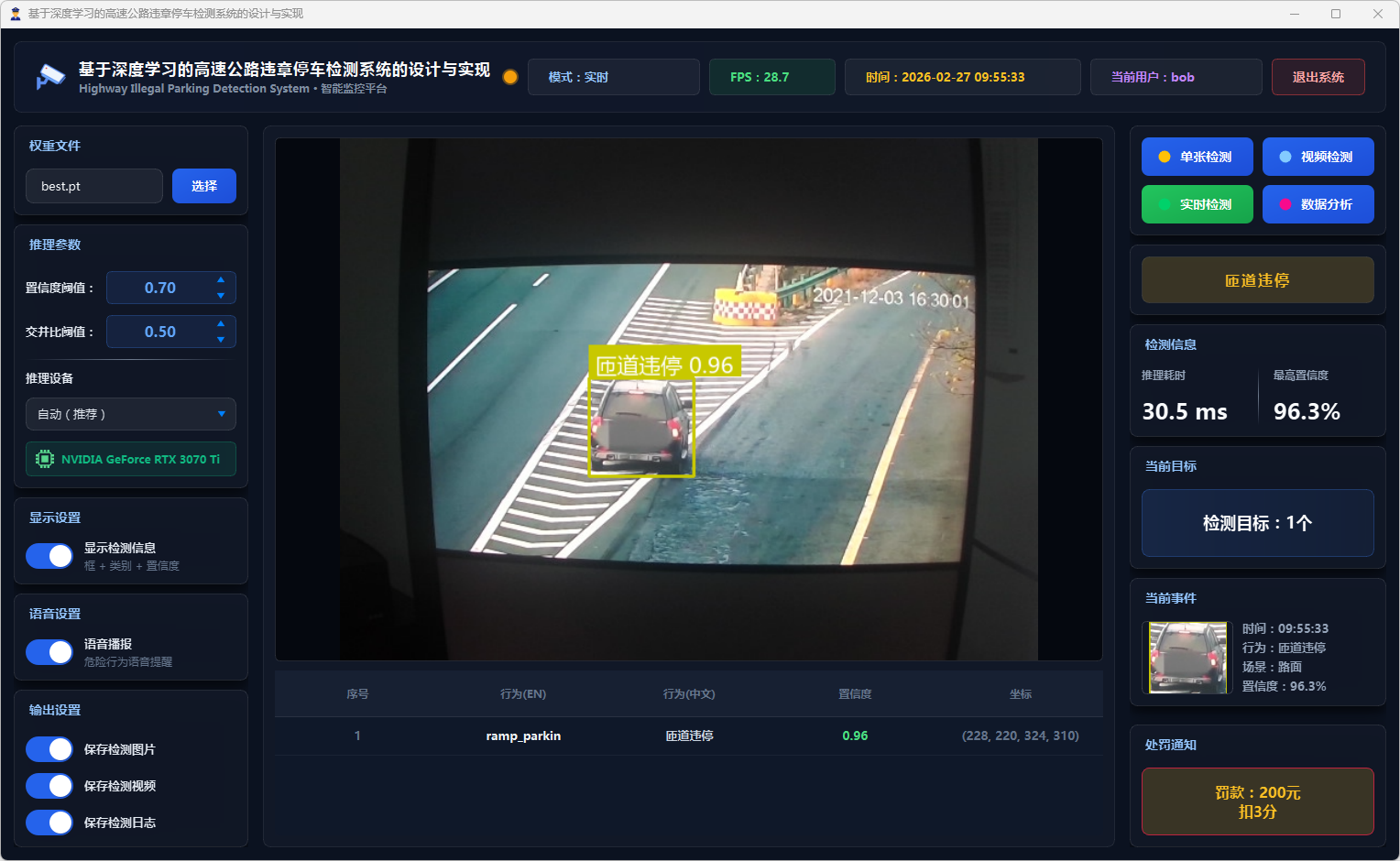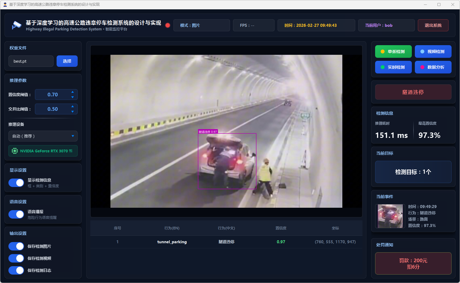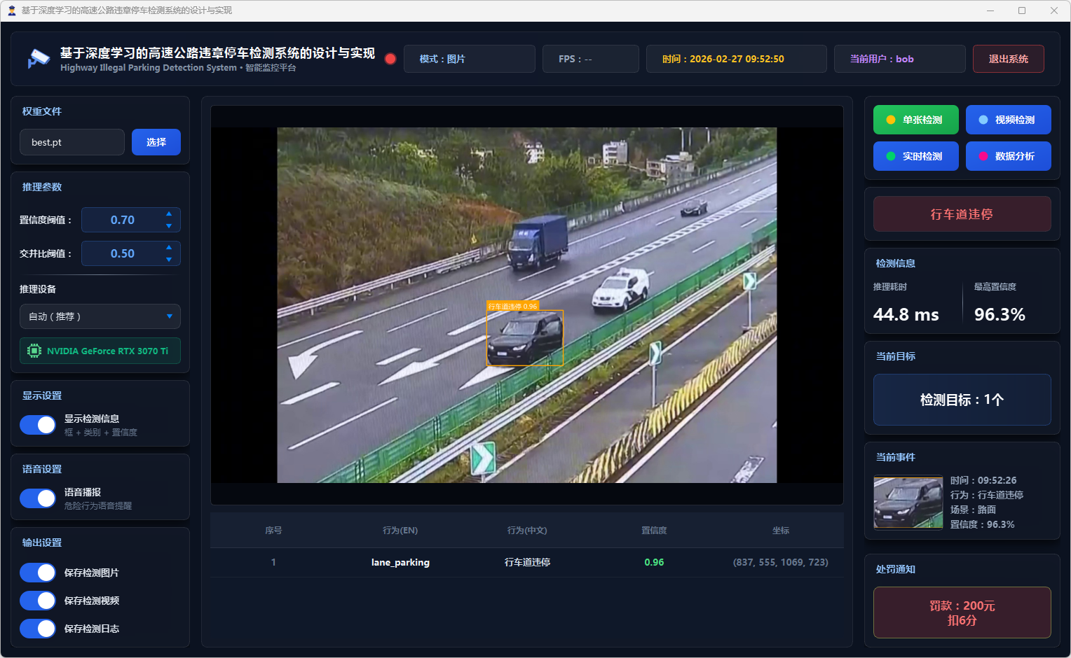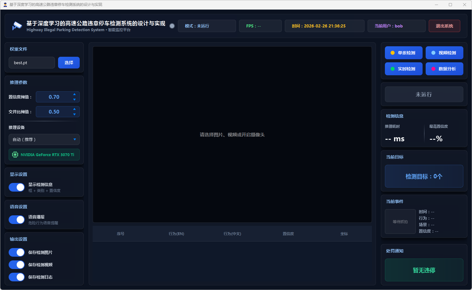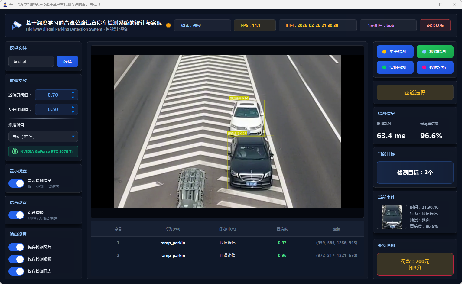 在系统设计层面,本文基于PySide6框架开发了功能完备的可视化检测平台,支持图片、视频文件及实时摄像头三种输入模式。系统设计了多级风险评估机制,依据违停类型将风险划分为一般违停与严重违停两个等级;引入连续三帧确认的稳定检测策略以抑制误报;集成语音告警模块实现危险违停行为的实时播报;同时采用SQLite数据库实现用户管理与检测记录的持久化存储,并提供违章行为分布、风险等级统计、检测趋势分析等数据可视化功能。
