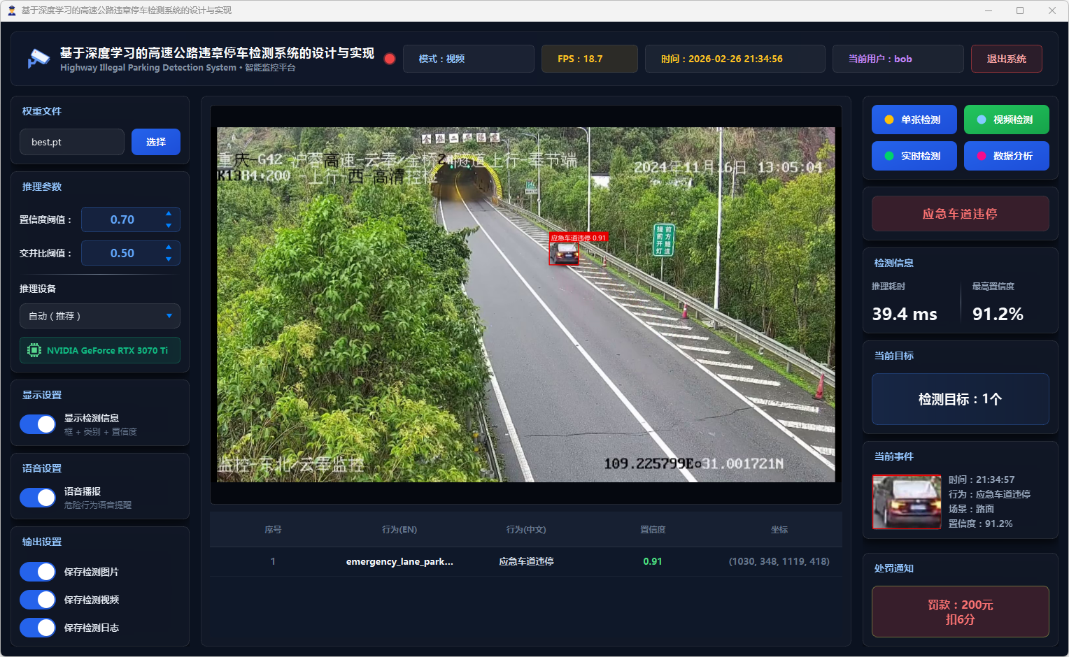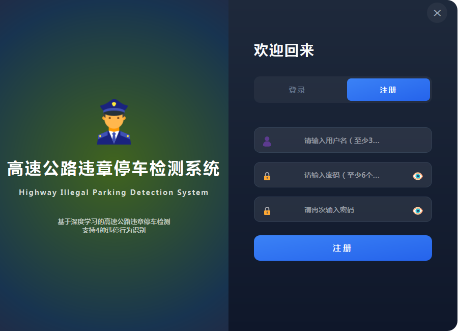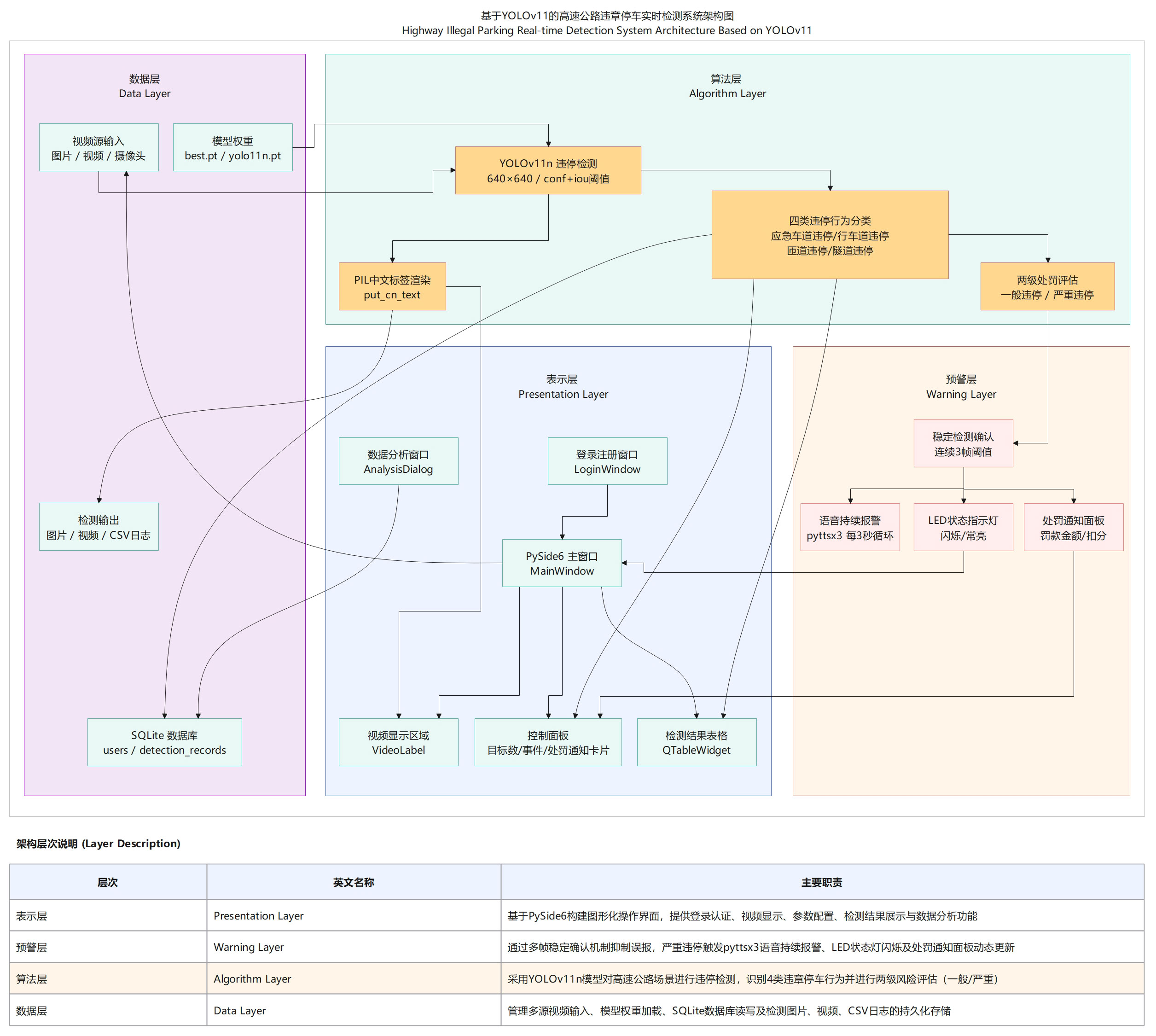 本系统基于YOLO11n深度学习模型,实现了高速公路场景下四类违章停车行为的智能检测与预警。系统采用PySide6构建图形用户界面,提供图片检测、视频检测、实时摄像头检测三种工作模式,并集成了两级风险评估、语音持续报警、数据统计分析、检测记录管理等功能,为高速公路违章停车智能监控提供高效、可靠的技术支撑。
