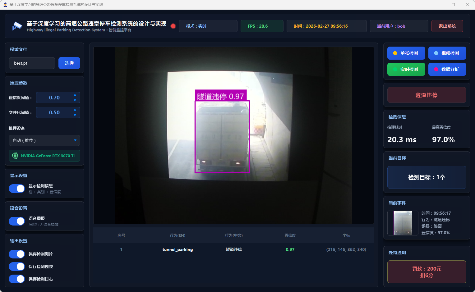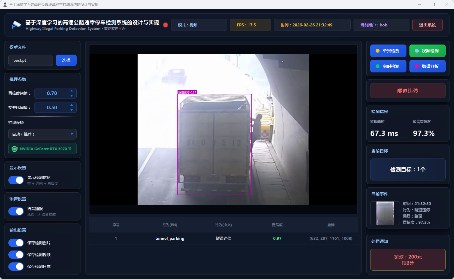 摄像头检测模式支持连接本地摄像头进行实时违章停车行为检测,用户点击”摄像头检测”按钮后,系统启动DetectWorker线程打开本地摄像头进行实时视频流检测,实时显示检测结果、违停类别和置信度,当连续3帧稳定检测到高风险违停行为(应急车道违停、行车道违停、隧道违停)时自动触发pyttsx3语音持续报警(每3秒播报),界面实时更新处罚通知信息和检测统计信息,检测记录自动保存到数据库。