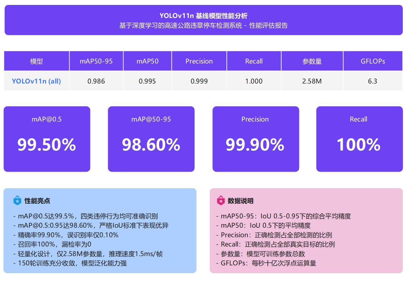 YOLO11n基线模型在高速公路违章停车检测任务上展现出优异的综合性能,以2.58M参数量和6.3 GFLOPs的轻量化设计实现了99.5% mAP@0.5和98.6% mAP@0.5:0.95的检测精度,精确率达99.9%、召回率达100%,误识别率仅0.1%、漏检率为0。经过150轮充分训练, 模型在1,484张训练集和424张验证集上稳定收敛,mAP@0.5:0.95从初始的55.94%提升至98.60%,提升幅度达42.66%,验证了模型的 学习能力和泛化性能。该模型支持CPU/GPU多平台部署,推理速度达1.5ms/帧,适合实时视频流处理和边缘设备应用,为高速公路 违章停车智能检测系统提供了高效、可靠、易部署的技术解决方案。