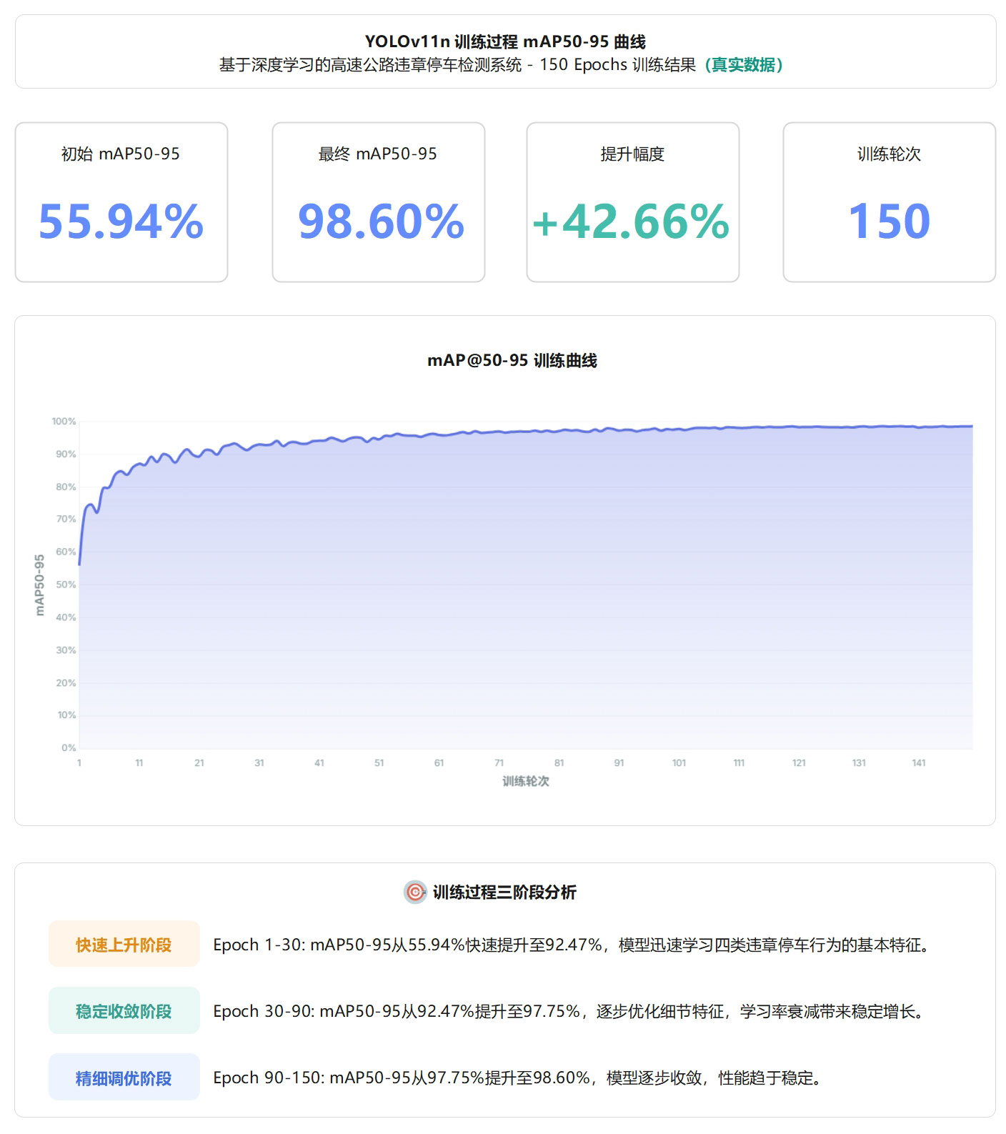该曲线展示了模型在高速公路违章停车检测任务上的学习能力和收敛特性,验证了训练策略的有效性。最终98.60% mAP@0.5:0.95配合99.5% mAP@0.5,表明模型在严格评估标准下仍保持优异性能。