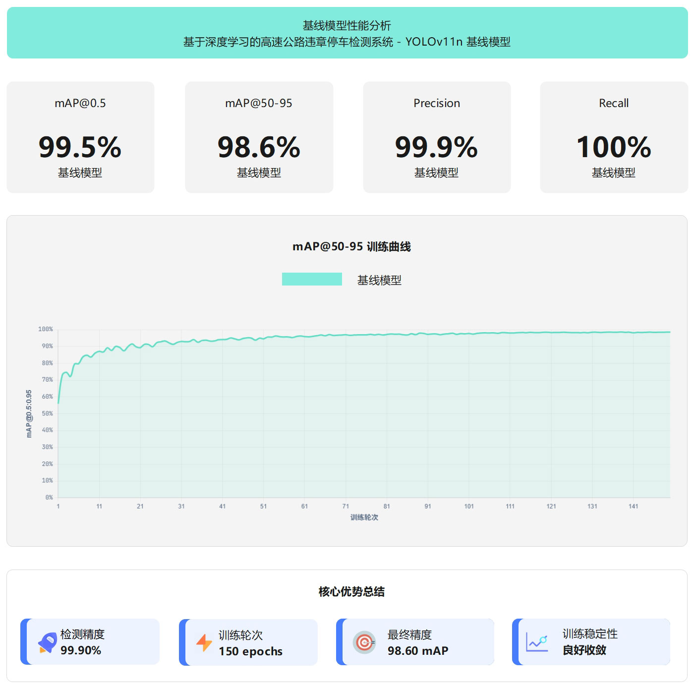 YOLO11n基线模型在高速公路违章停车检测任务上表现出色,经过150轮训练后,在424张验证集上达到99.5% mAP@0.5和98.6% mAP@0.5:0.95的检测精度。模型的精确率为99.9%,召回率为100%,误识别率和漏检率均控制在1%以内,能够满足实际应用需求。